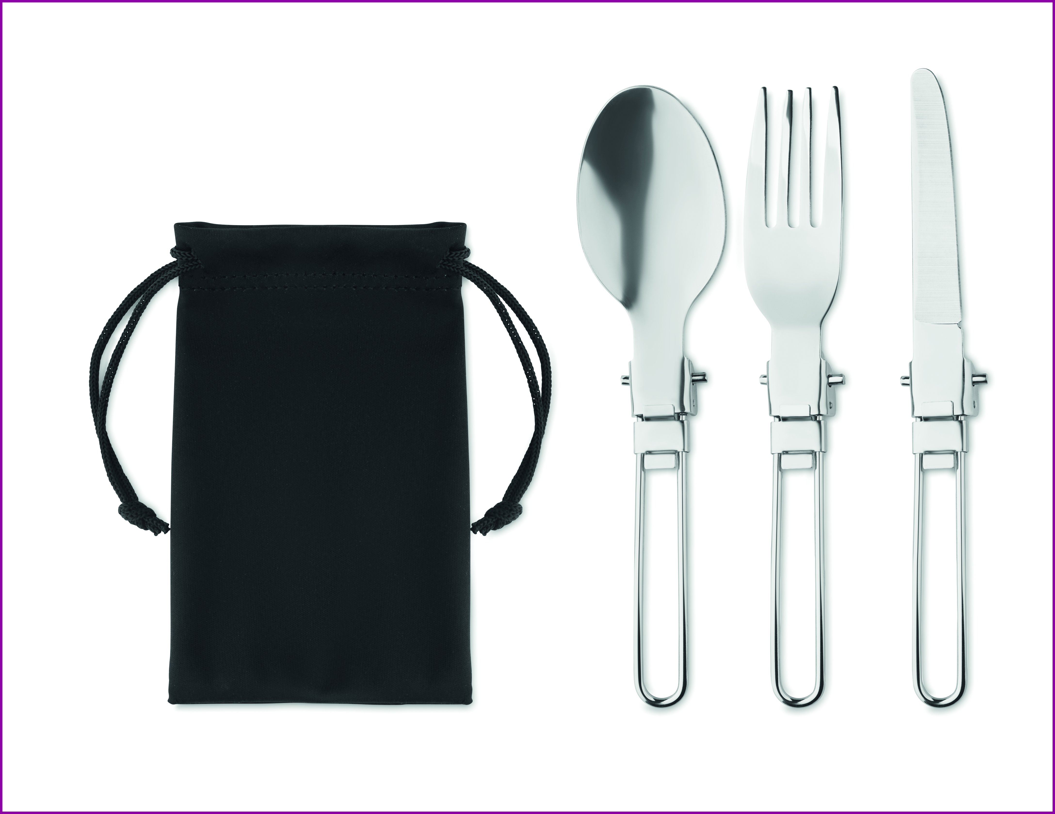 Ruostumattomasta teräksestä valmistettu ruokailusetti RPET pussissa.