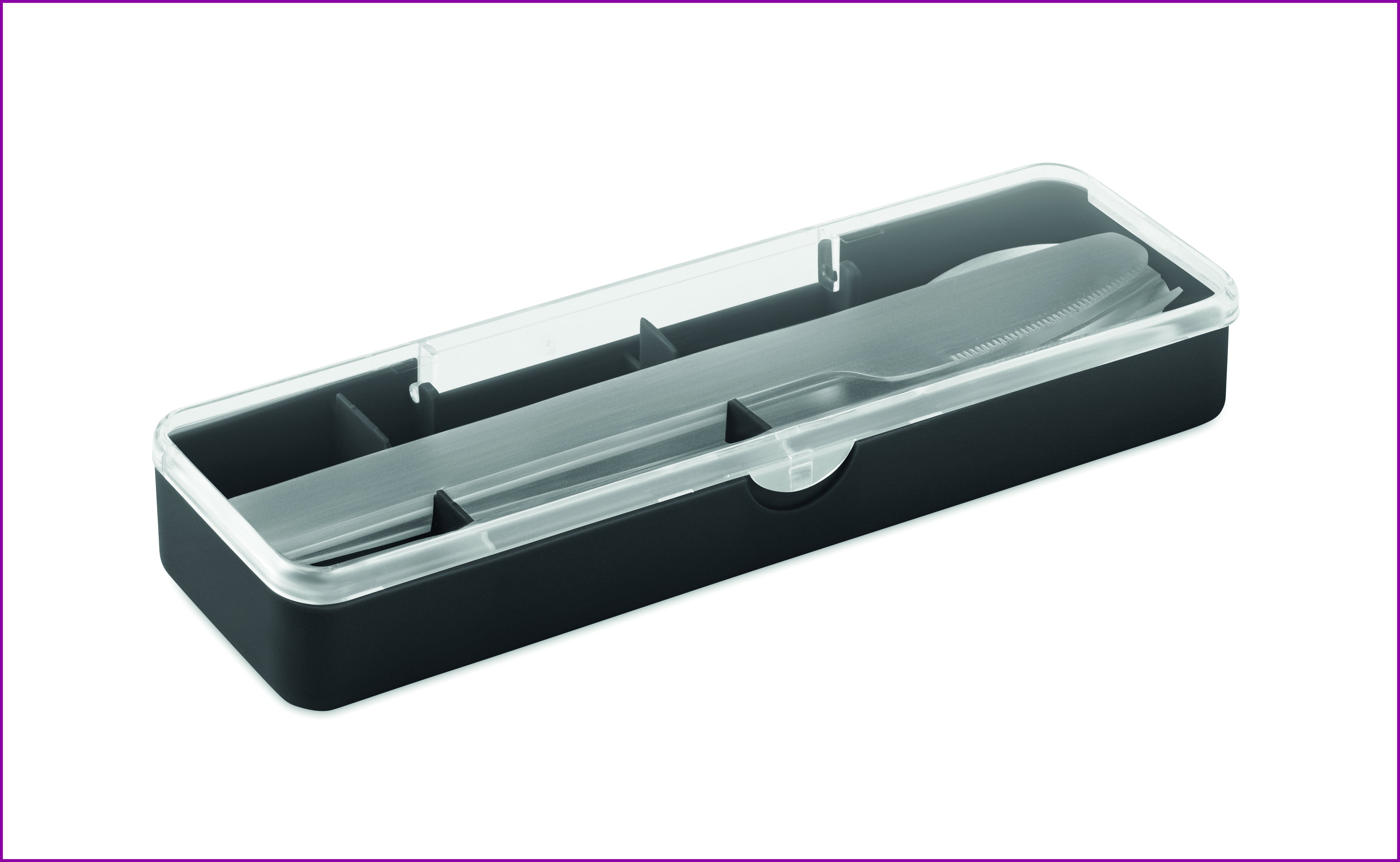 Ruostumattomasta teräksestä valmistettu aterinsetti PP-kotelossa. Tämä setti sisältää haarukan, veitsen ja lusikan.