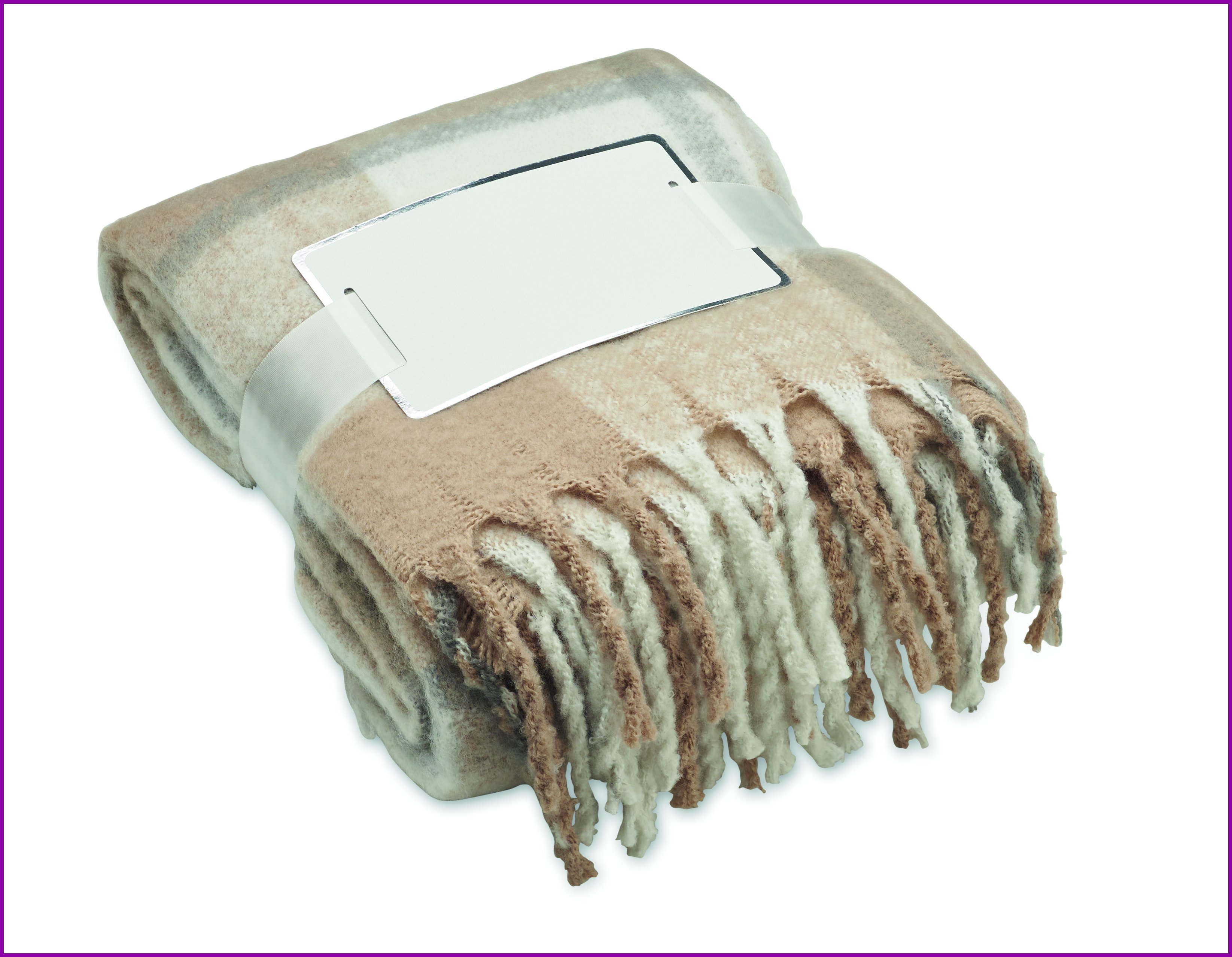 Ruudullinen mohair- RPET polyesterihuopa, jossa on käsin rullattuja hapsuja. Kääritty nauhaan ja tulostettavaan korttiin.