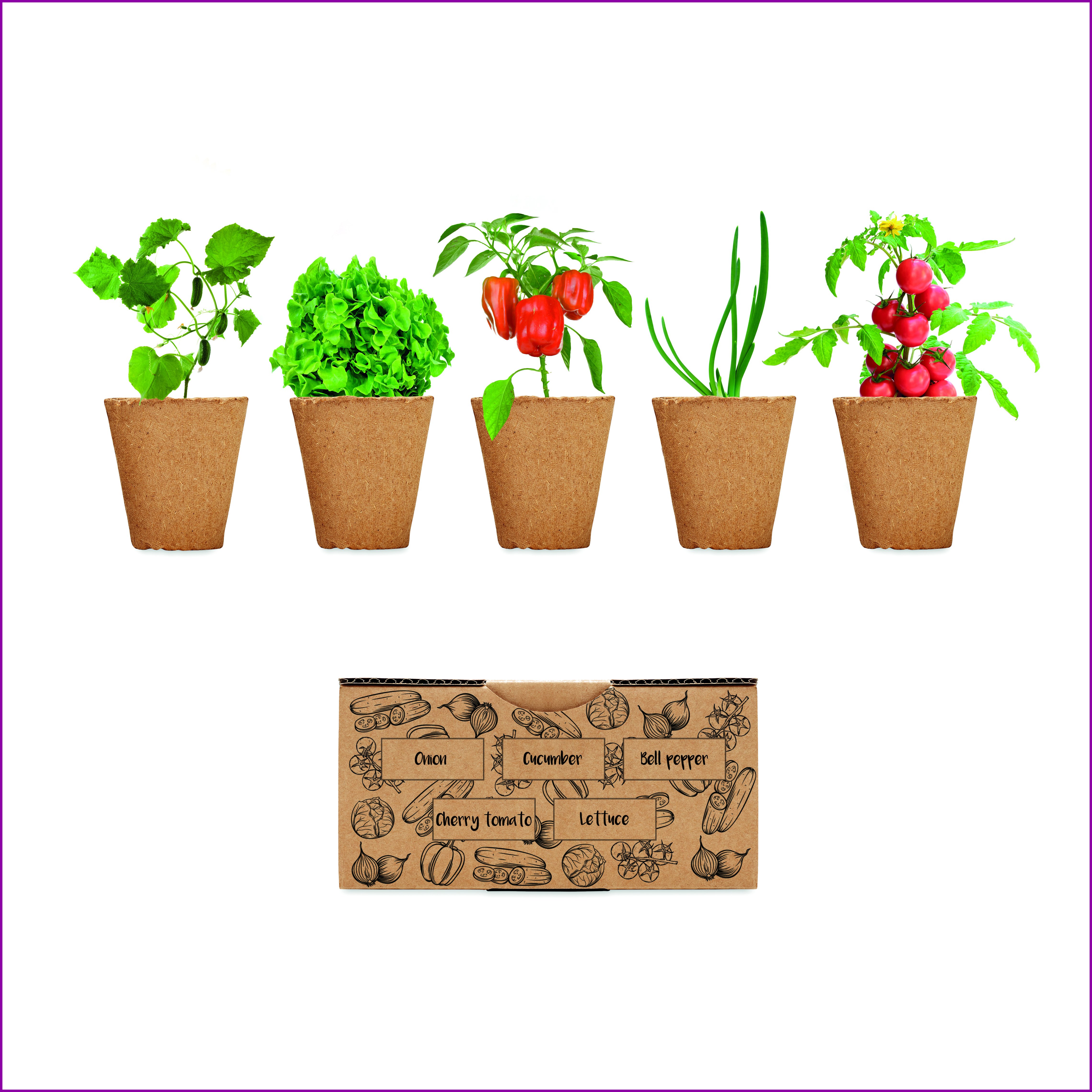 Salaatin kasvatus sarja, sisältää sipulin, kurkun, paprikan, tomaatin ja lehtisalaatin siemeniä. Eurooppa tuotantoa. Sisältää turvenapin.