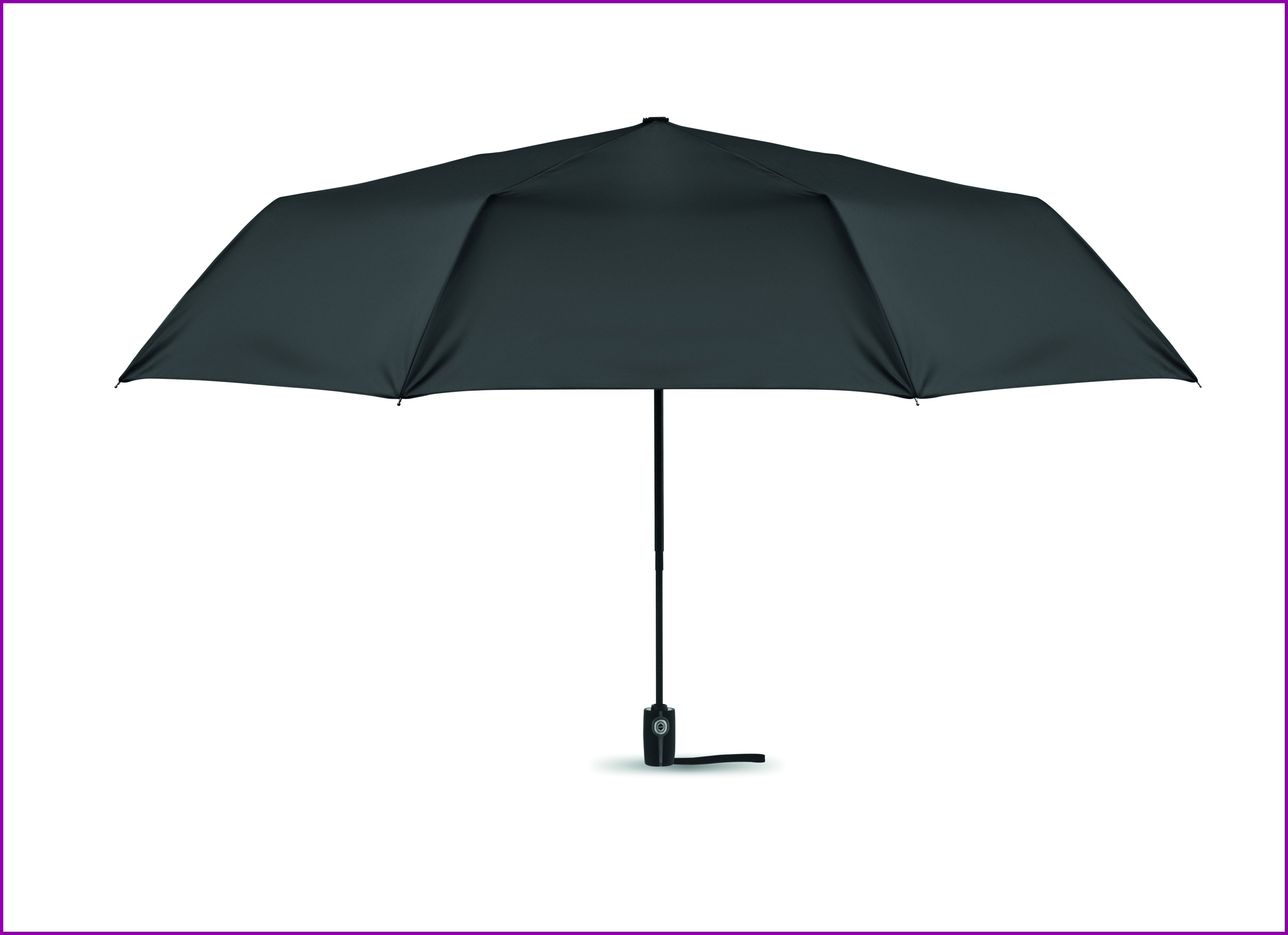 27 tuuman kolmeen osaan taittuva automaattisesti avautuva/sulkeutuva tuulenkestävä sateenvarjo. 190T pongee-materiaalista valmistettu varjo jossa on musta pinnoitettu teräsvarsi, lasikuituruoteet ja musta PP-kahva painikkeella. Suojapussi.