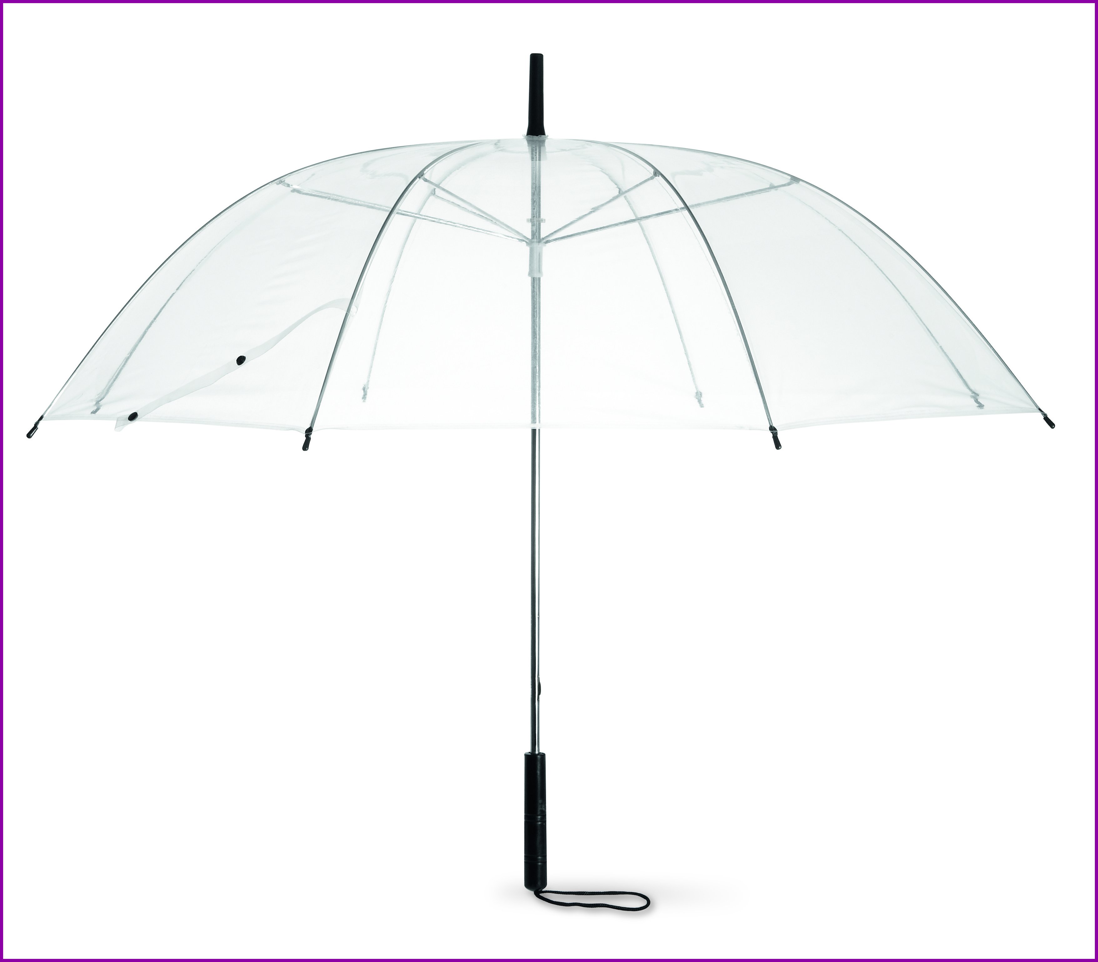 23 tuuman ja 8-paneelinen kirkas PE sateenvarjo, kahvassa musta rannenauha. Manuaalinen avaus.