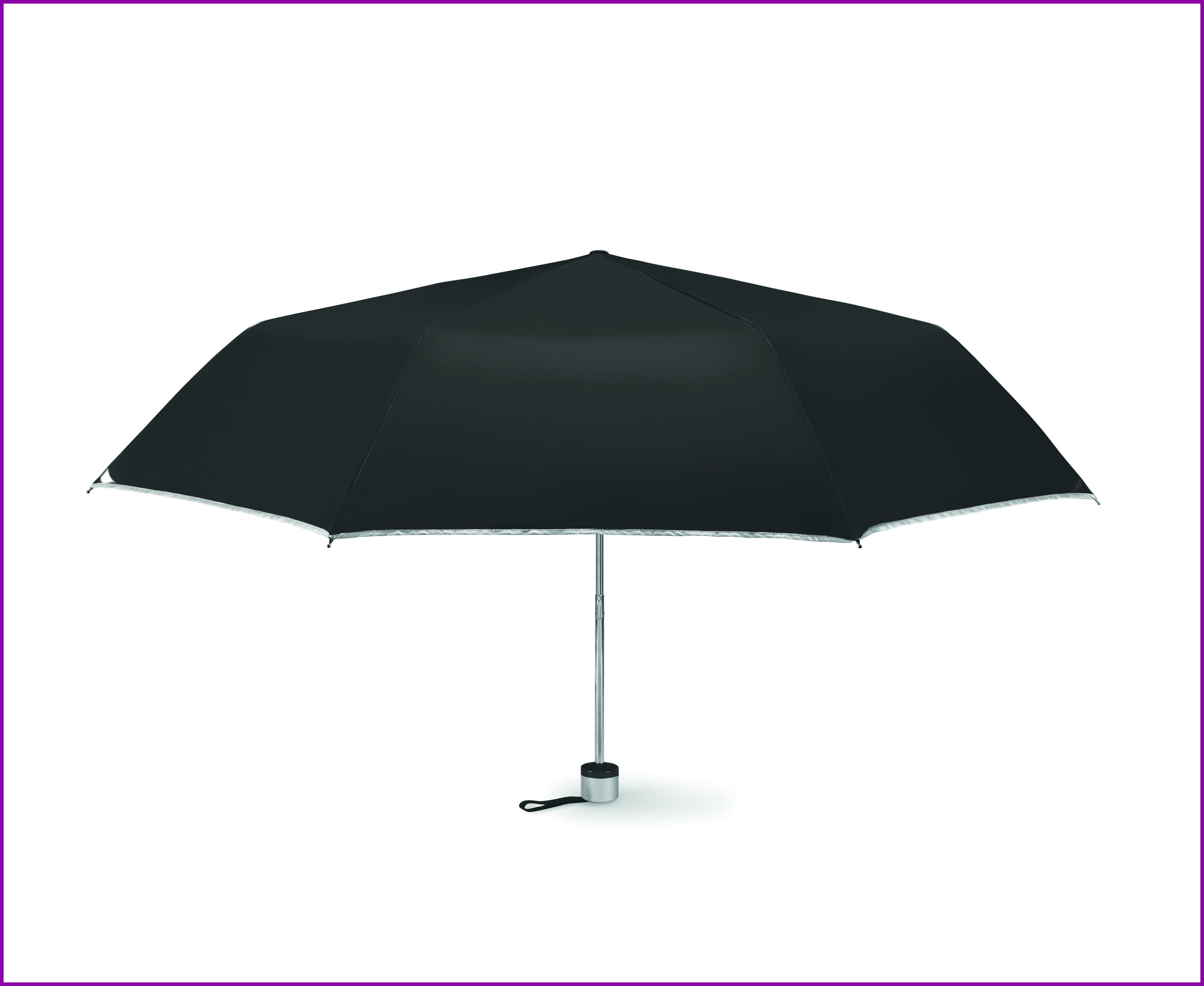 190T polyesterinen 21 tuuman sateenverjo, manuaalinen avaus. Sinkillä pinnoitettu metallivarsi ja kärjet. Mustalla päällystettyt metalli ruoteet, ulkoiset värilliset paneelit sisäpuolelta hopea maalipeite. Värillinen muovikahva hopealla reunalla ja mustalla rannehihnalla. Taitettavissa kolmeen osaan, sisältää tuotteelle tarkoitetun säilytyspussin, hopealla reunuksella. Manuaalinen suljin.