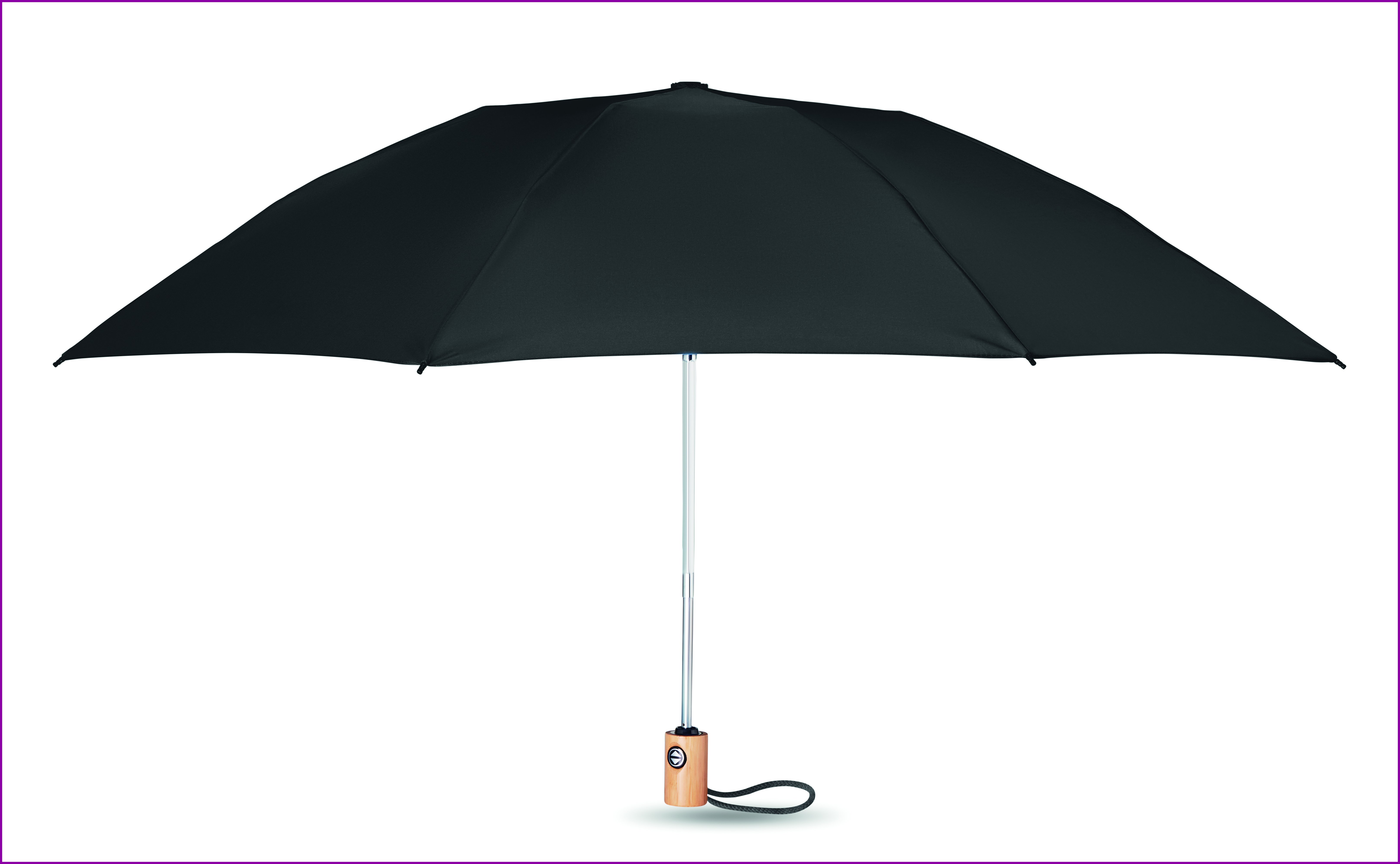 23 tuuman 190T pongee RPET automaattinen käännettävä sateenvarjo. Lasikuitu ruoteet tekevät tästä sateenvarjosta vahvan, mutta kevyen ottaa mukaan. Bambu kahva antaa sateenvarjolla luonnollisen ulkonäön ja puuvilla ranneke, helpottaa tuotteen ripustamisen. Sisältää yhteensopivan säilytyspussin. Luonnollisen materiaalin (bambu) vuoksi, tuotteiden värissä/ koossa saattaa olla erinäisyyksiä ja tämä voi vaikuttaa painatuksen lopputulokseen.