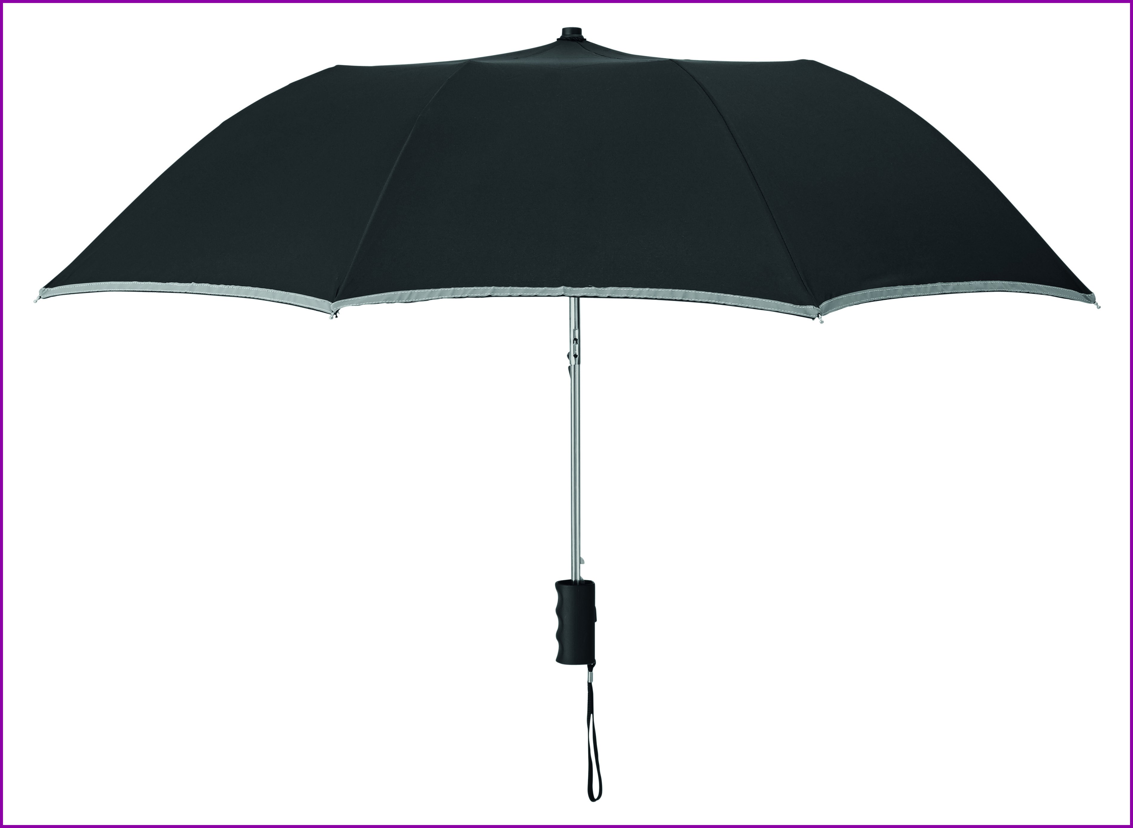 190T-pongee 2 osainen 21 tuuman sateenvarjo, automaattiavauksella. Sinkillä pinnoitetut teräsvaris, ruoteet ja kärki. Paneelien reunat heijastavalla verhoilulla, musta muovikahva rannehihnalla. Sisältää saman värisen säilytyspussin, manuaalinen suljin.