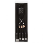 5-in-1-latauskaapeli, jossa on 3 liitintä (Type-C, Android, iPhone) ja rPET-johdot (valmistettu kierrätetyistä muovipulloista). USB-A- ja USB-C-liittimen ansiosta kaapeli on täysin yhteensopiva markkinoiden uusimpien tietokoneiden (USB-C) kanssa. Kärjissä metallia muistuttava pinta. Kaapelilla voi ladata jopa 3 laitetta samanaikaisesti. Toimitetaan kierrätettävässä rasiassa kierrätyspaperikortilla.Värit ja Koot