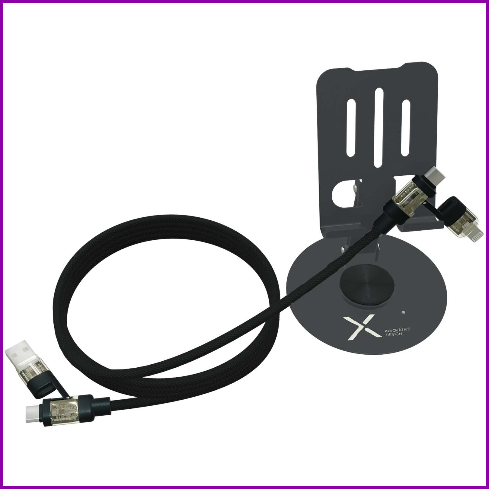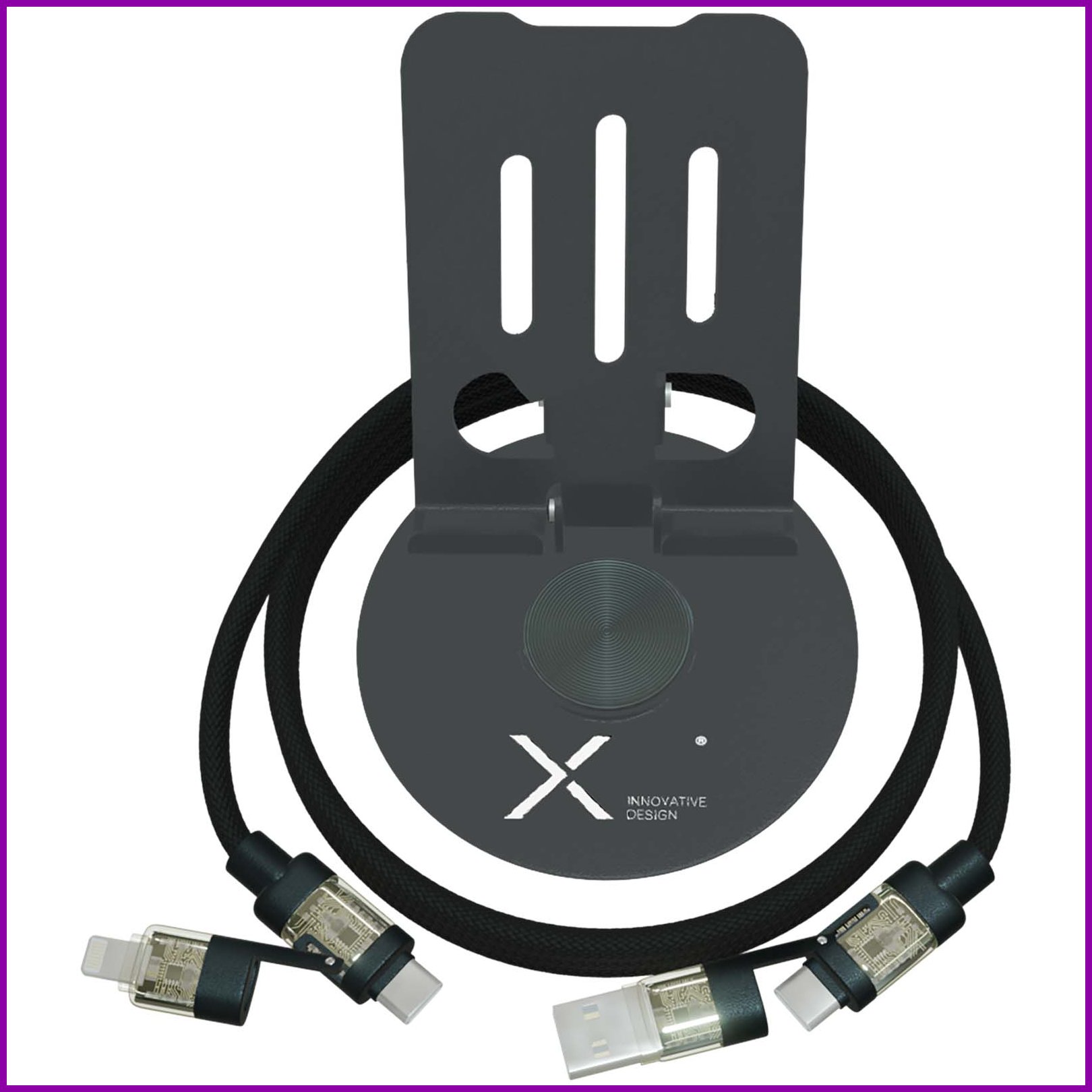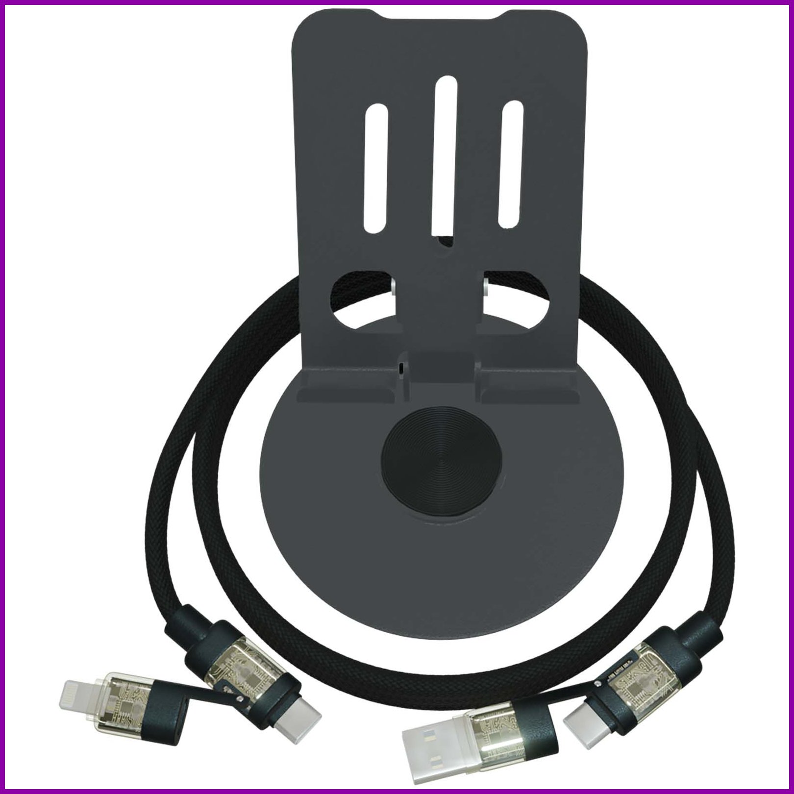 Taittuva, aseenvärinen 360°:n kääntyvä puhelinjalusta valaistuilla kärjillä. Mukana toimitetaan 4-in-1 rPET-kaapeli, jossa on kaksoistulo (USB-C/USB-A) ja kaksoislähtö (USB-C/Lightning). Tämä tuote on ensisijaisesti suunniteltu puhelinkäyttöön, mutta mukana tulevan 240 W:n kaapelin ansiosta sillä voi ladata myös suuritehoisia elektronisia laitteita, kuten kannettavia tietokoneita, pelikonsoleita, varavirtalähteitä, drooneja ja paljon muuta. Laserkaiverrettu logo jalustassa. Toimitetaan kierrätetystä kartongista valmistetussa lahjapakkauksessa.Värit ja Koot