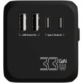 Matka-adapteri kahdella USB-A-liitännällä, kahdella Type-C-liitännällä ja yhdellä Type-C:n ultranopealla 33 W:n GaN- ja PD-liitännällä. Tätä adapteria voi käyttää 150 maassa. Mukana toimitetaan säilytysrasia.Värit ja Koot