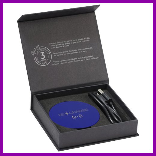 Hinta 31,42€ / KPLKumista ja puusta valmistettu 10 W langaton latausasema, jossa on RPET-materiaalista valmistettu latauskaapeli. Voidaan merkitä valaistavalla logolla. Toimitetaan mustassa kierrästysmateriaalista valmistetussa lahjapaketissa, jossa on magneettinen sulkumekanismi. EUROPE EUIPO -patentti.Varastossa