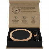 Ranskalaisesta tammipuusta valmistettu 10 W:n langaton latausasema pehmeällä kumipinnoitteella. Tämä latausasema on Qi-yhteensopiva ja siihen voidaan lisätä yksilöitävä valaistu logo. Toimitetaan kierrätyspaperista valmistetussa lahjapaketissa, jossa on magneettinen sulkumekanismi.Värit ja Koot