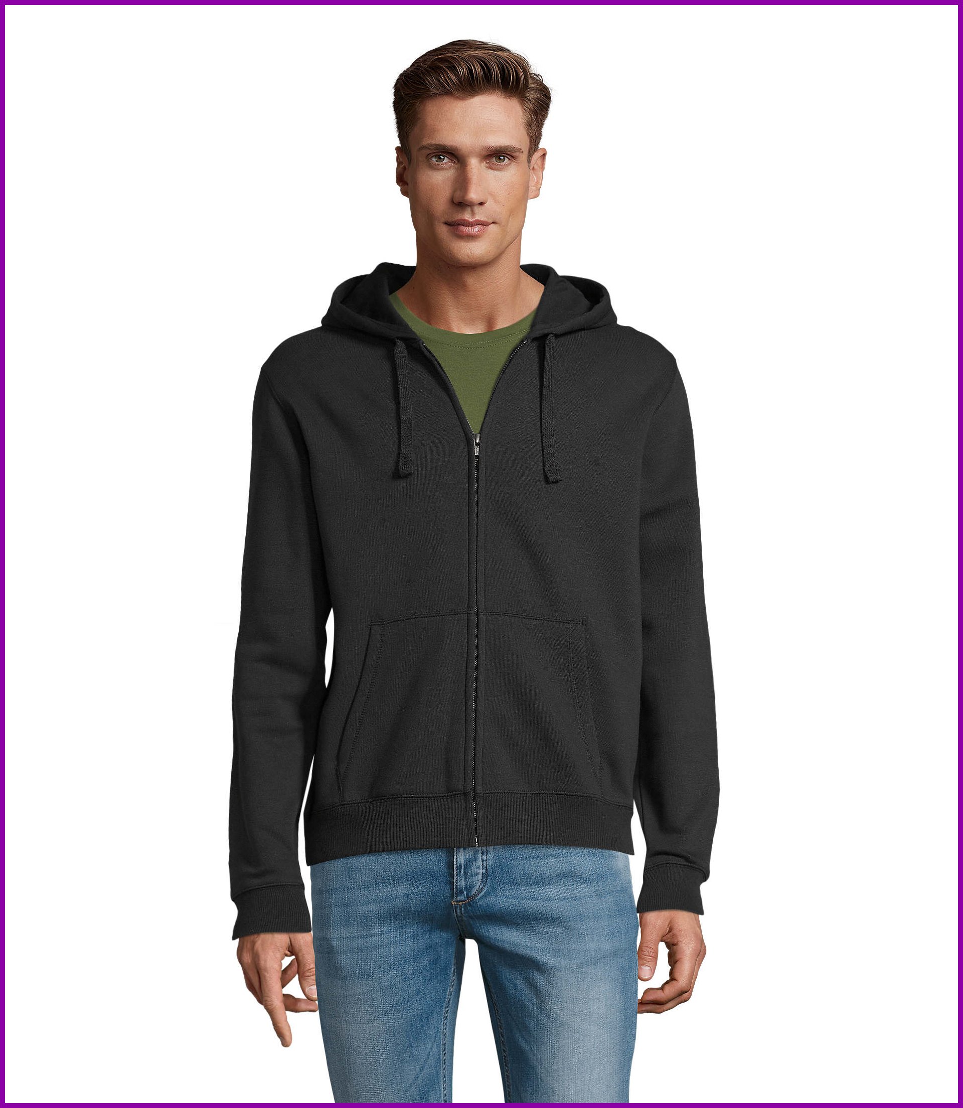 SOL'S SPIKE MEN. Miesten vetoketjullinen huppari, 80 % rengaskehrätty puuvilla - 20 % polyesteri Harjattu vuori, Ulkopuoli: 100 % puuvilla FLEECE 280 LSF (Low Shrinkage Fabric), Asetetut hihat, 2 etutaskua, Leikattu ja ommeltu, Vuorattu huppu, jossa on sävyyn sopiva kiristysnyöri, 2x2-ripsiset hihansuut ja helma. Puolikuun muotoinen sisäkaulus, teipattu kaula-aukko, YKK-vetoketju. OEKO-TEX®. Myydään vain painatuksen kanssa.