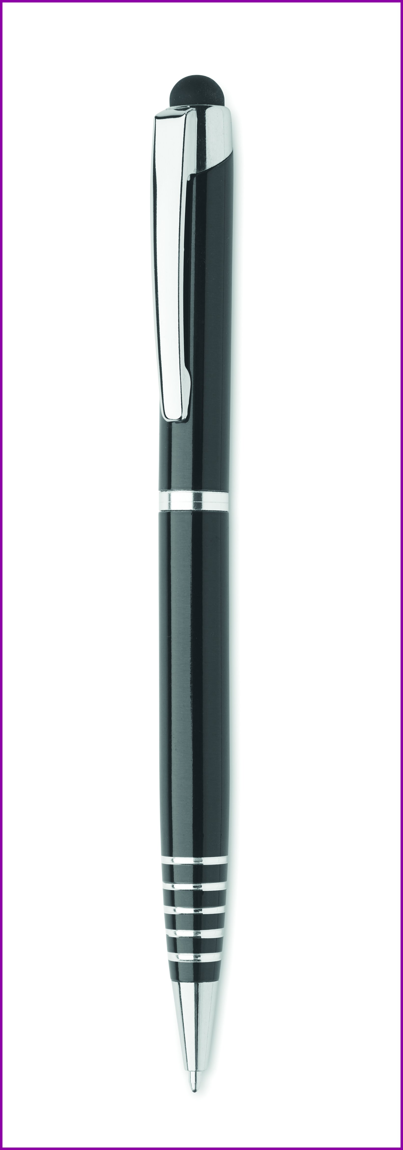 Kierrätysalumiinista valmistettu kuulakärkikynä, jossa on kosketusnäyttöpää. Sininen muste.
