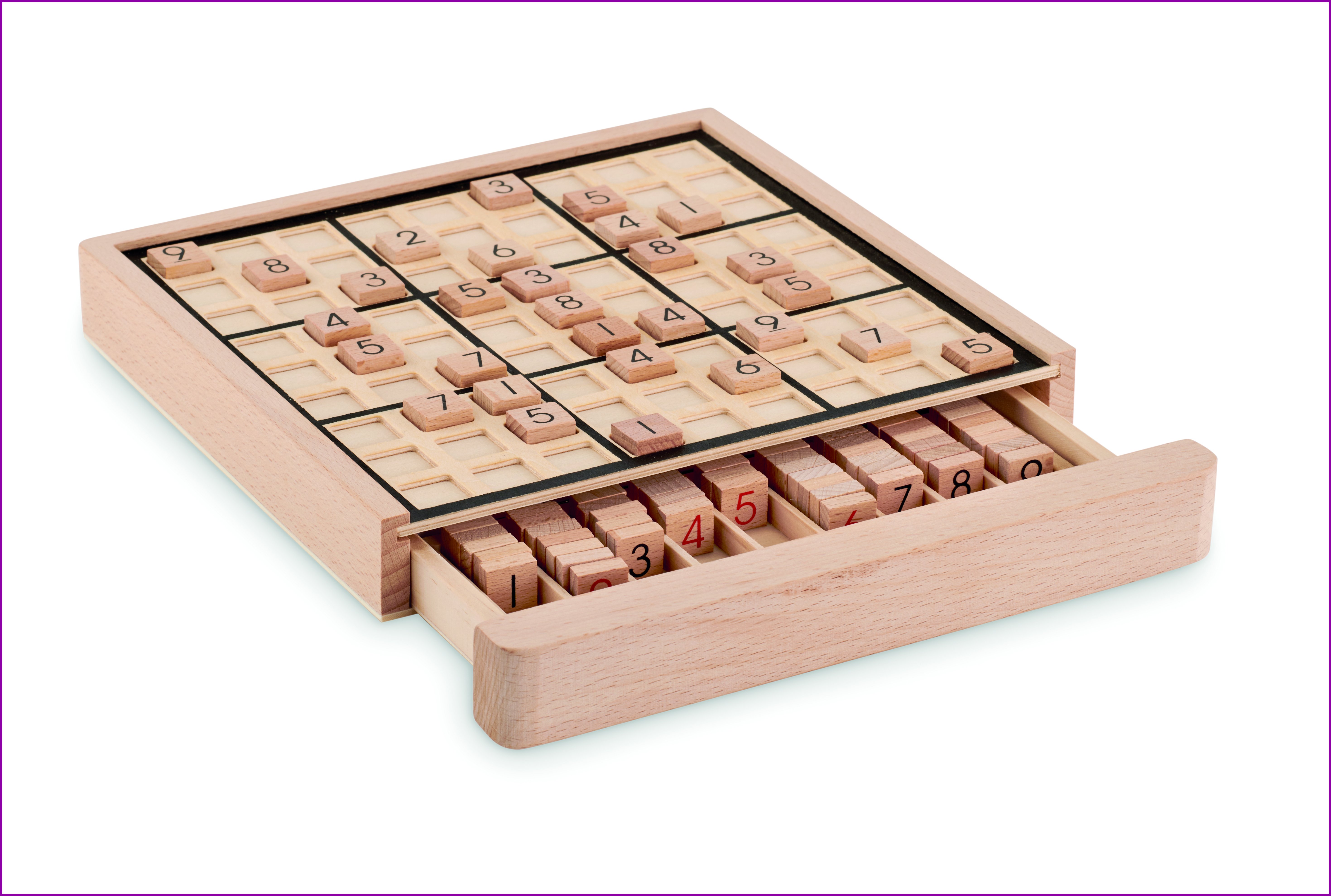 Puusta tehty sudokutaulu. Sisältää 99 numeroitua puulaattaa. Mukana peliopas, jossa ohjeet, arvoitukset ja ratkaisut.