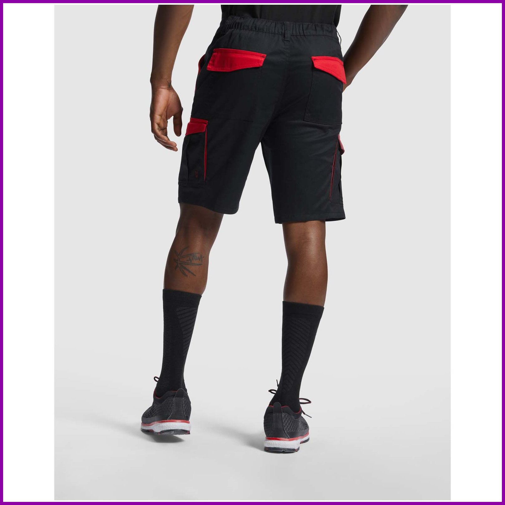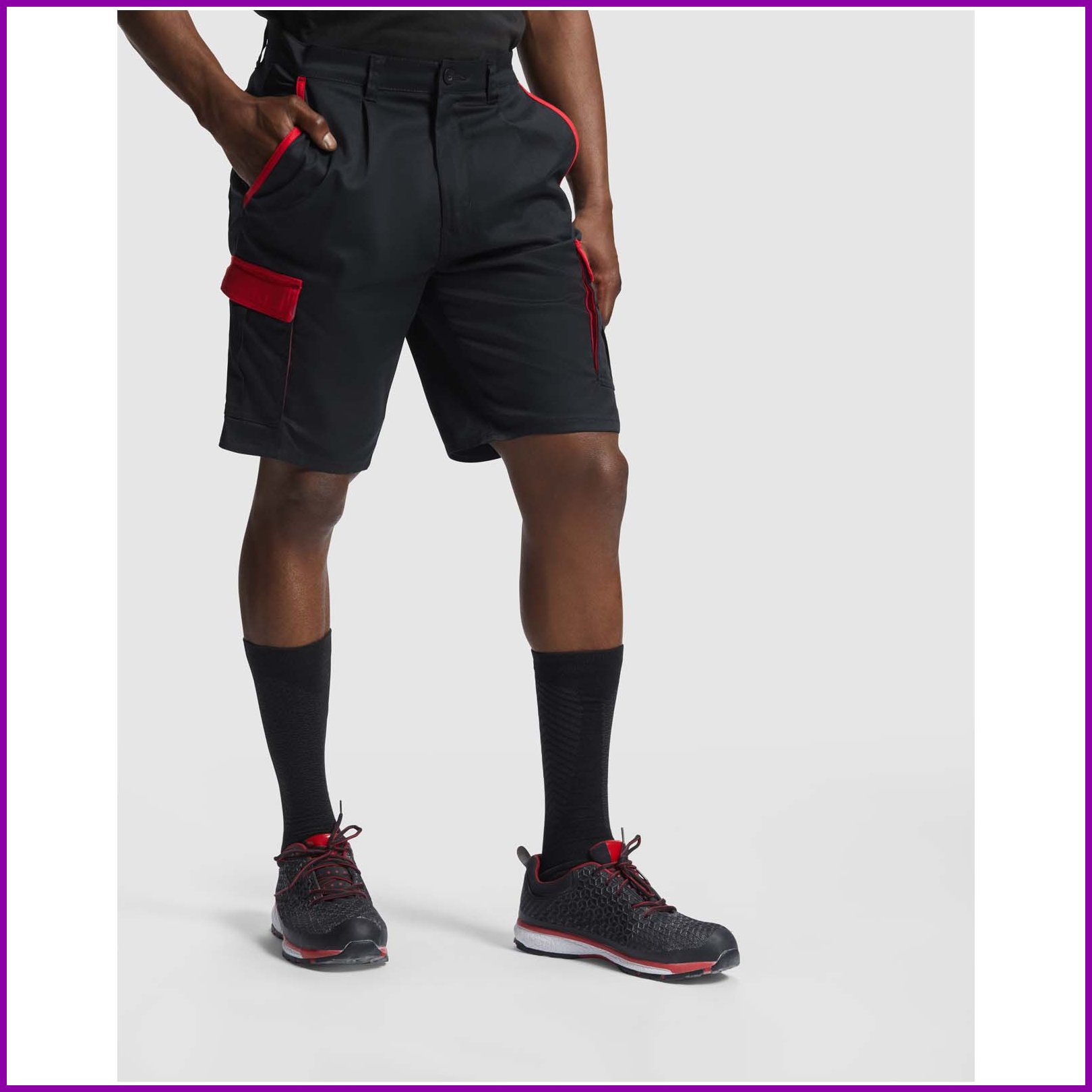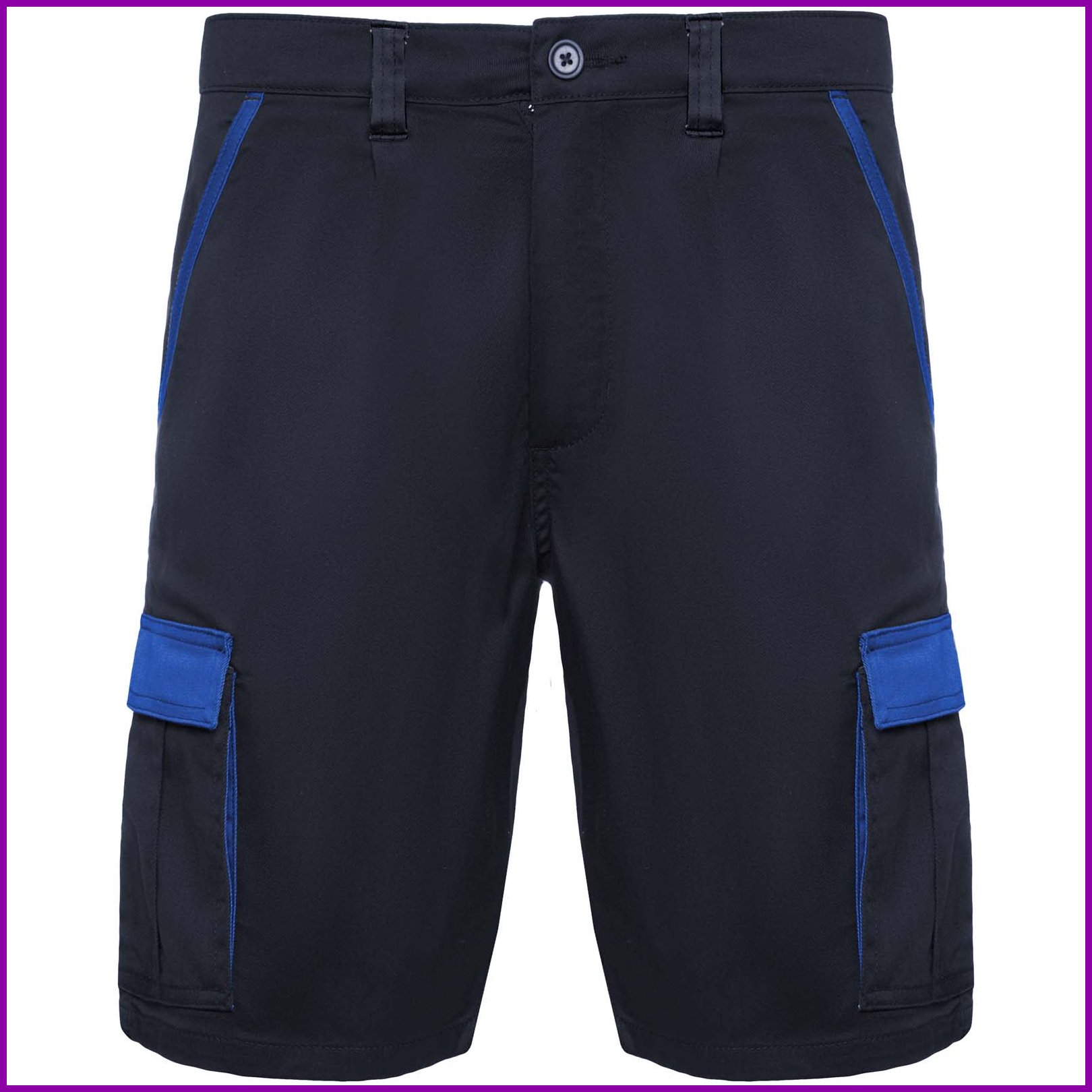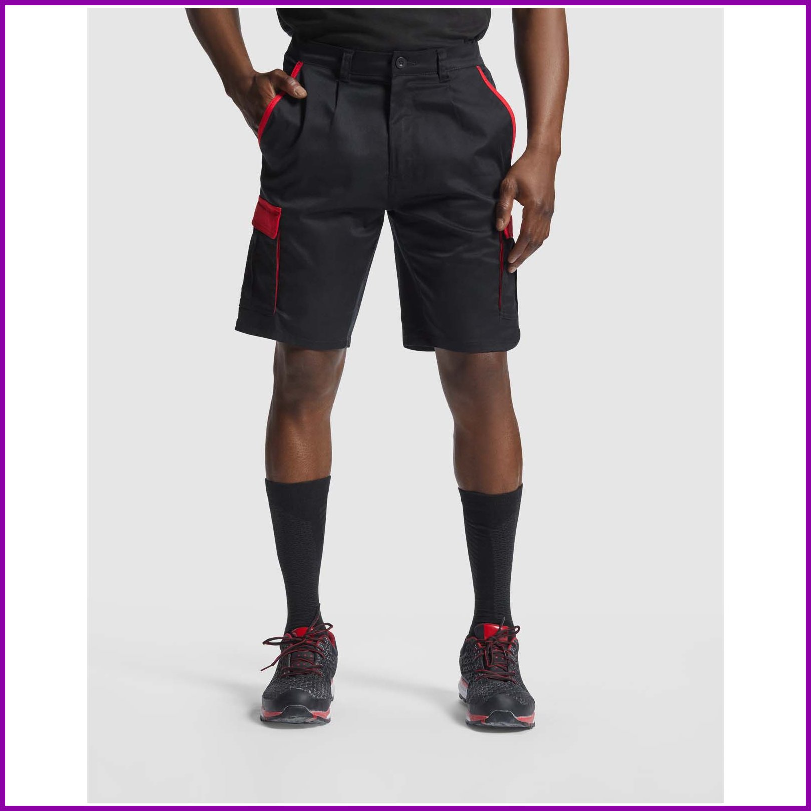 Työshortsit väriyhdistelmällä. Mukava ja säädettävä kangas. Takana joustava vyötärönauha. Kontrastiväriset vyönlenkit, läpät, laskokset ja reunukset. Kaksi etutaskua. Kaksi takataskua, joissa on läpät ja tarranauhakiinnitys. Kaksi laskostettua sivutaskua, joissa on läpät ja tarranauhakiinnitys.