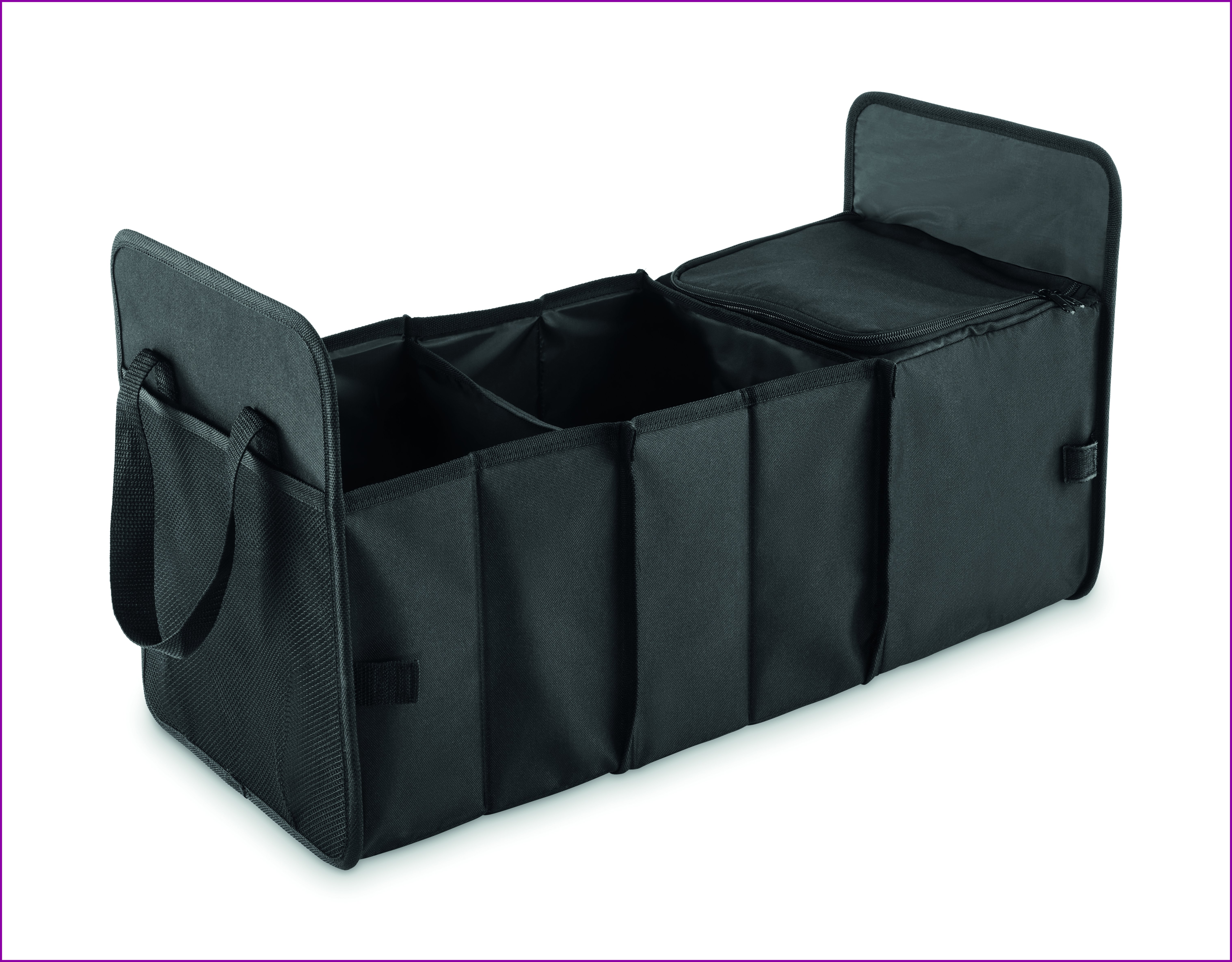 Kokoontaitettava autonjärjestäjä 600D RPET-polyesteristä, 3 lokeroa, joista yksi kylmälokero.