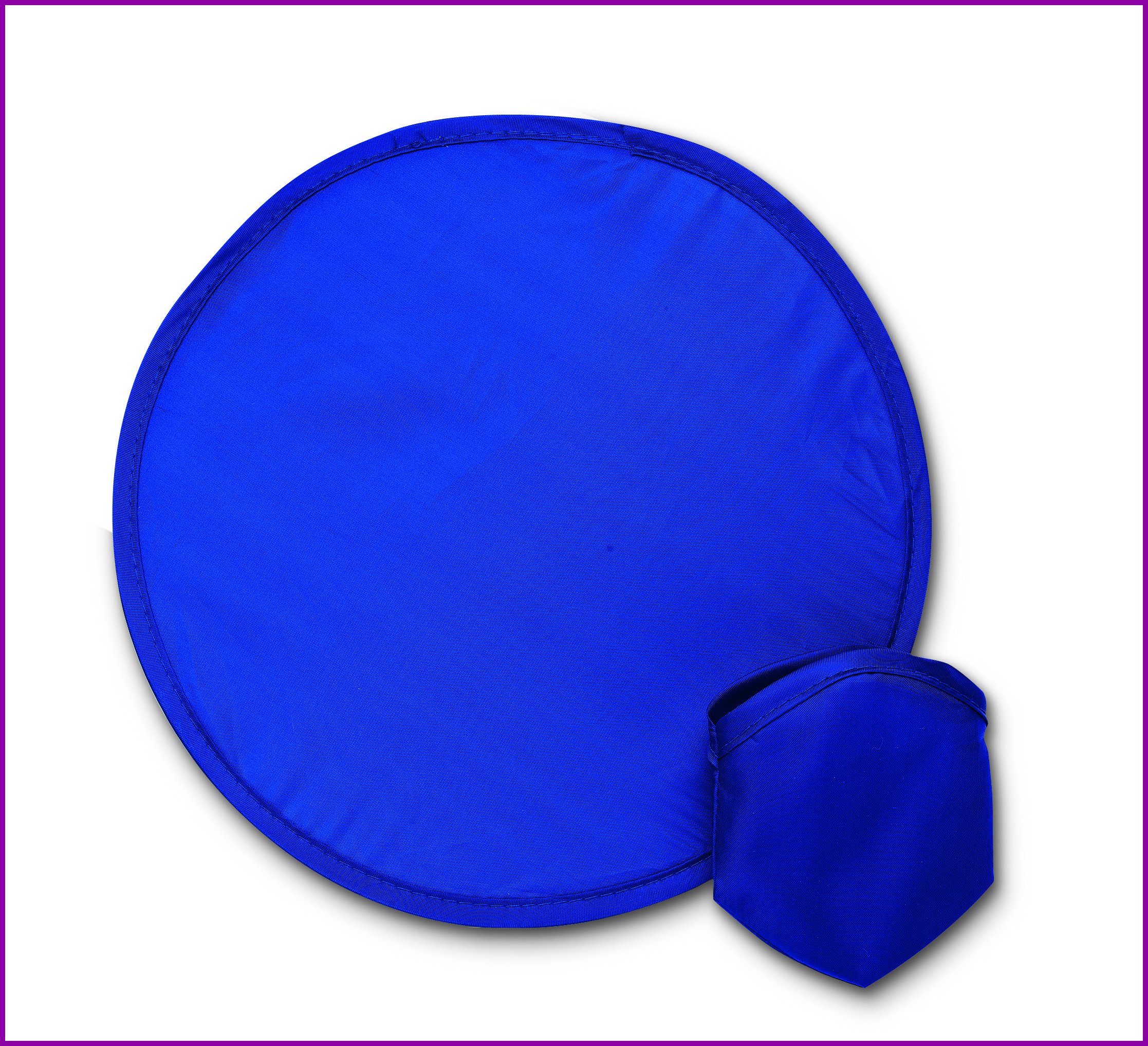 Taitettava frisbee pussissa, molemmat tuotteet valmistettu polyesteristä.