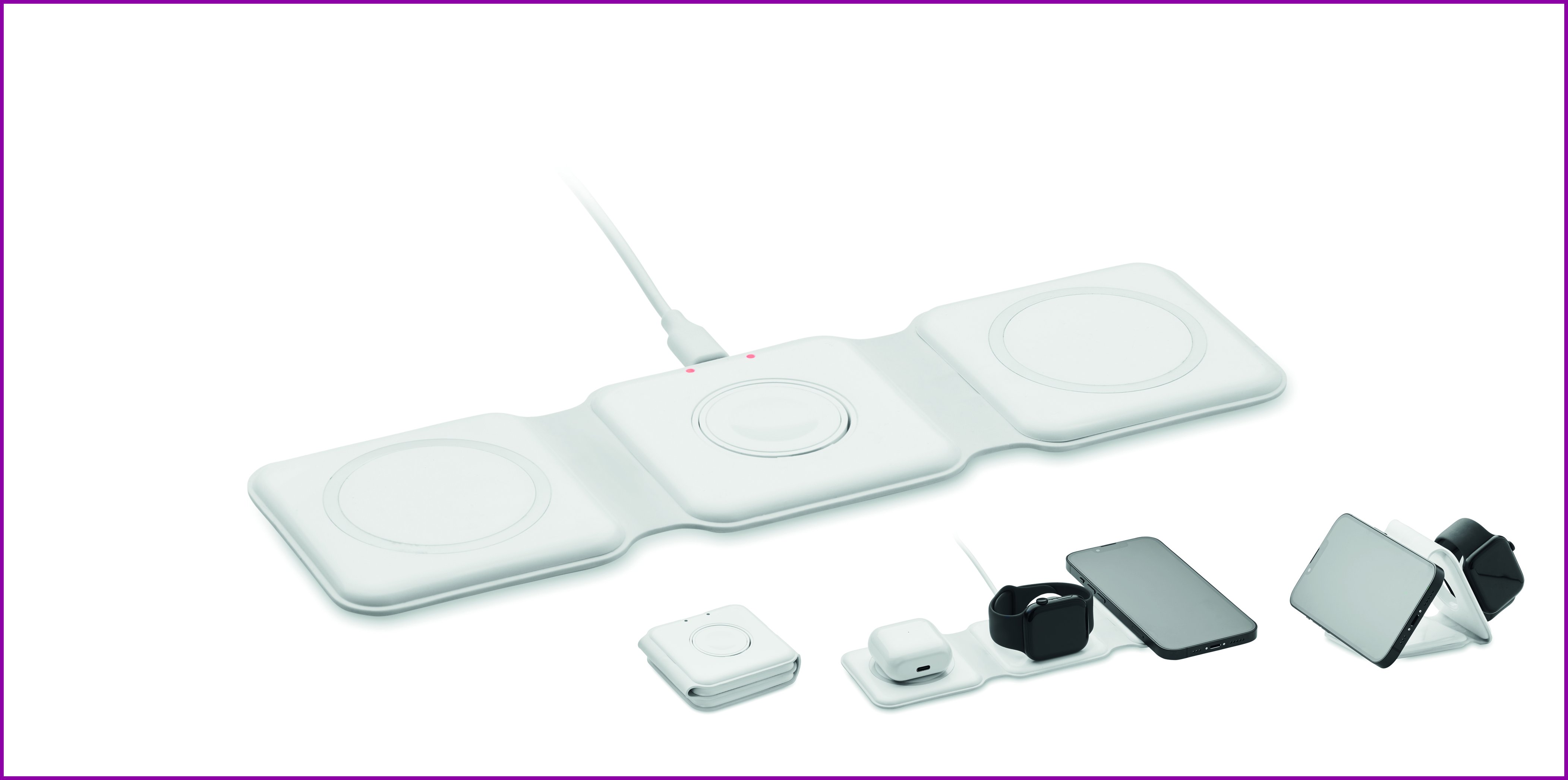 3 in 1 kokoontaitettava latausasema ABS-materiaalista. 3 langatonta latauspaikkaa. Tulo: 2-in-1 Type-C ja Type-A.