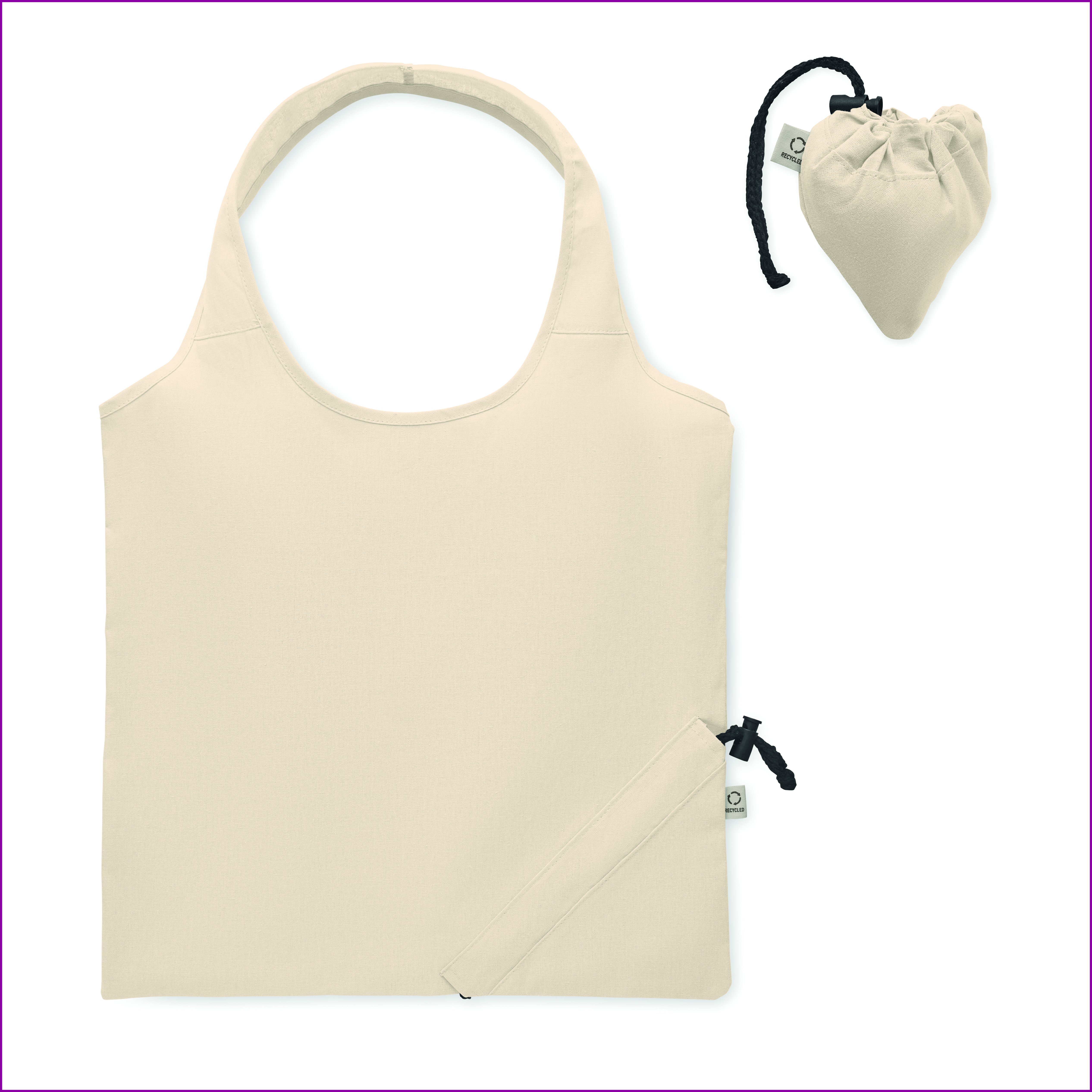 Kierrätetty esikulutettu puuvillainen kokoontaitettava ostoskassi (70 % kierrätettyä puuvillaa ja 30 % RPET:tä). 140 gr/m².