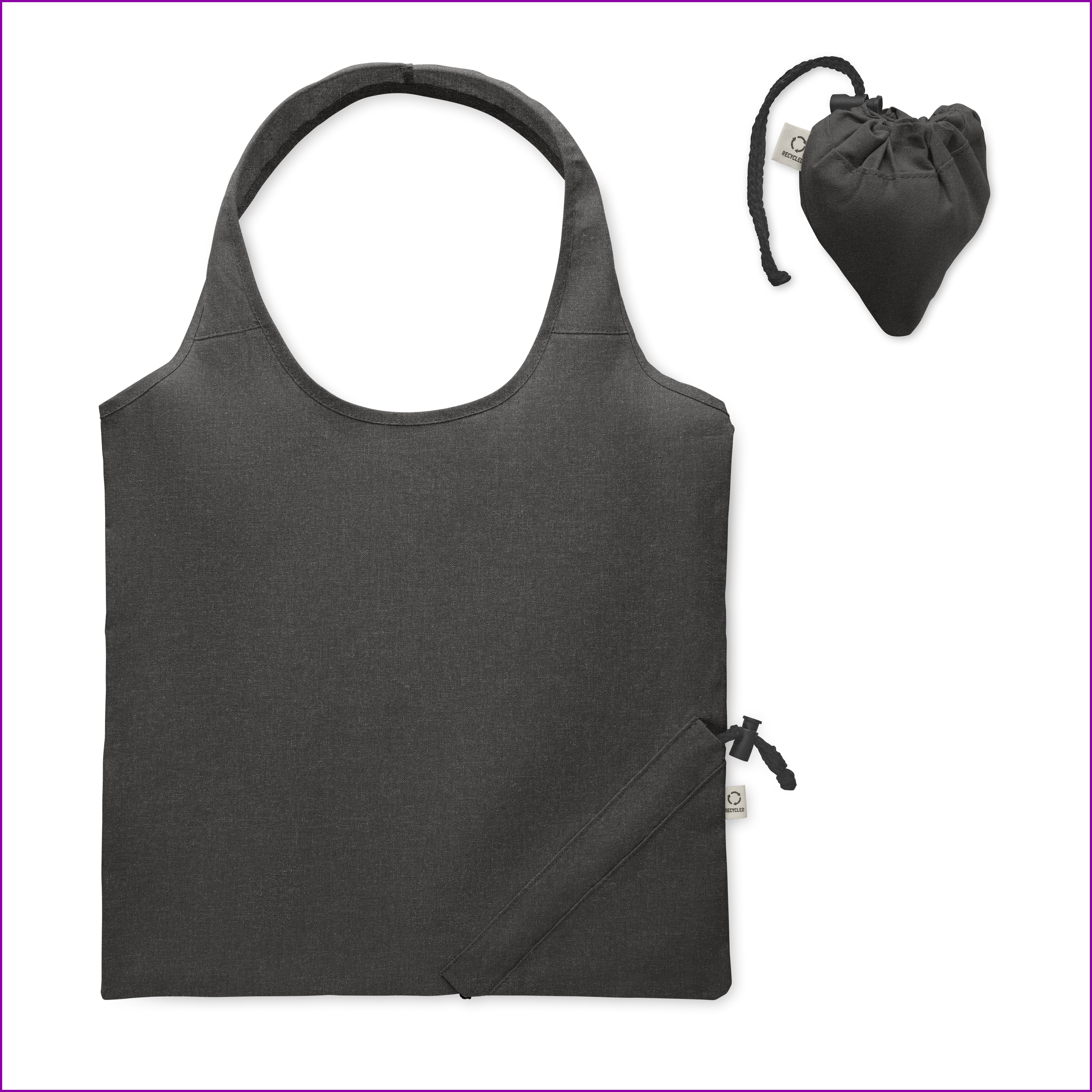 Kierrätetty esikulutettu puuvillainen kokoontaitettava ostoskassi (70 % kierrätettyä puuvillaa ja 30 % RPET:tä). 140 gr/m².