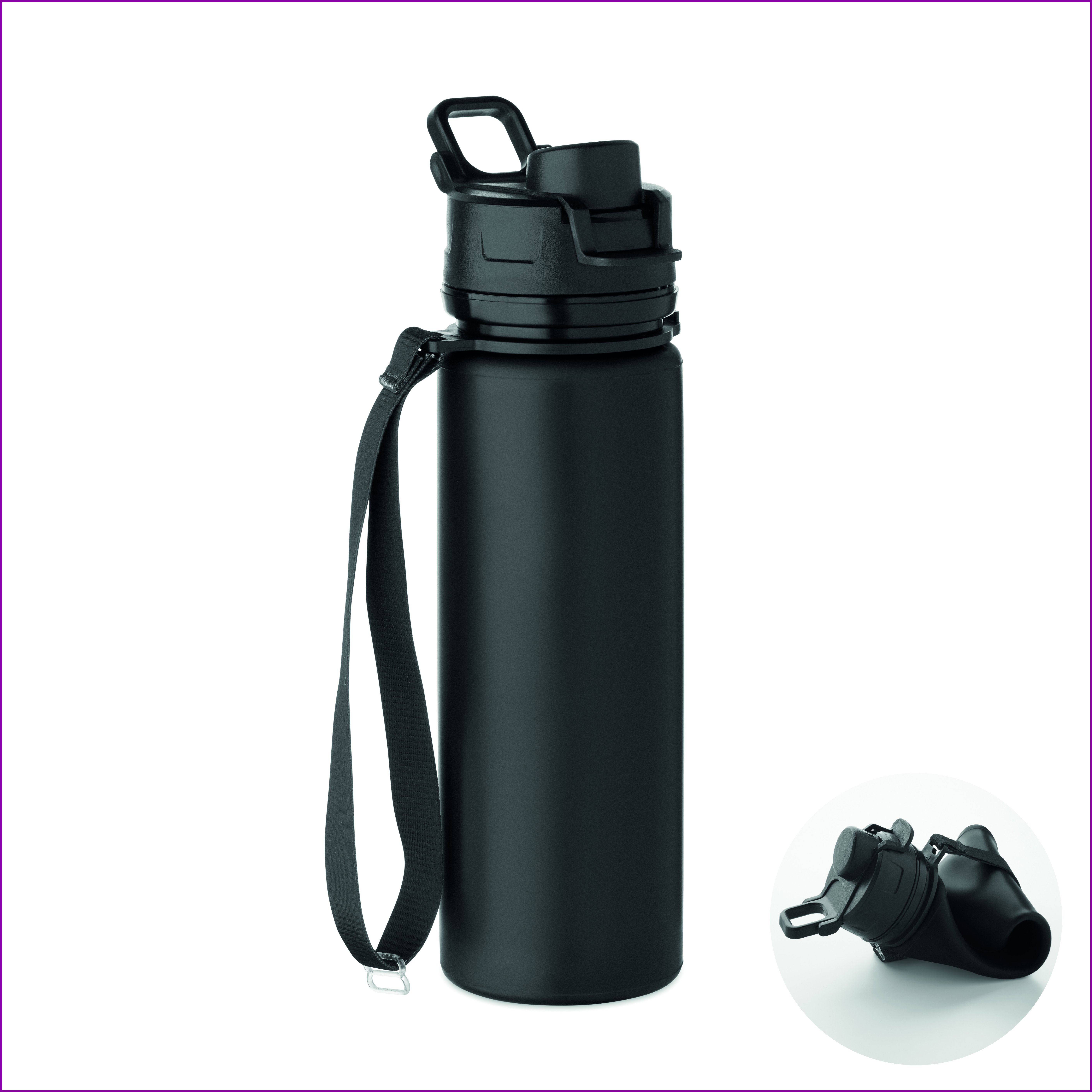 Kokoontaitettava silikoniurheilupullo, jossa on PP-kansi, kahva, polyesterihihna ja läpinäkyvä solki, joka kiinnittää pullon kokoontaitettuna. Vuotamaton. Tilavuus 500 ml.