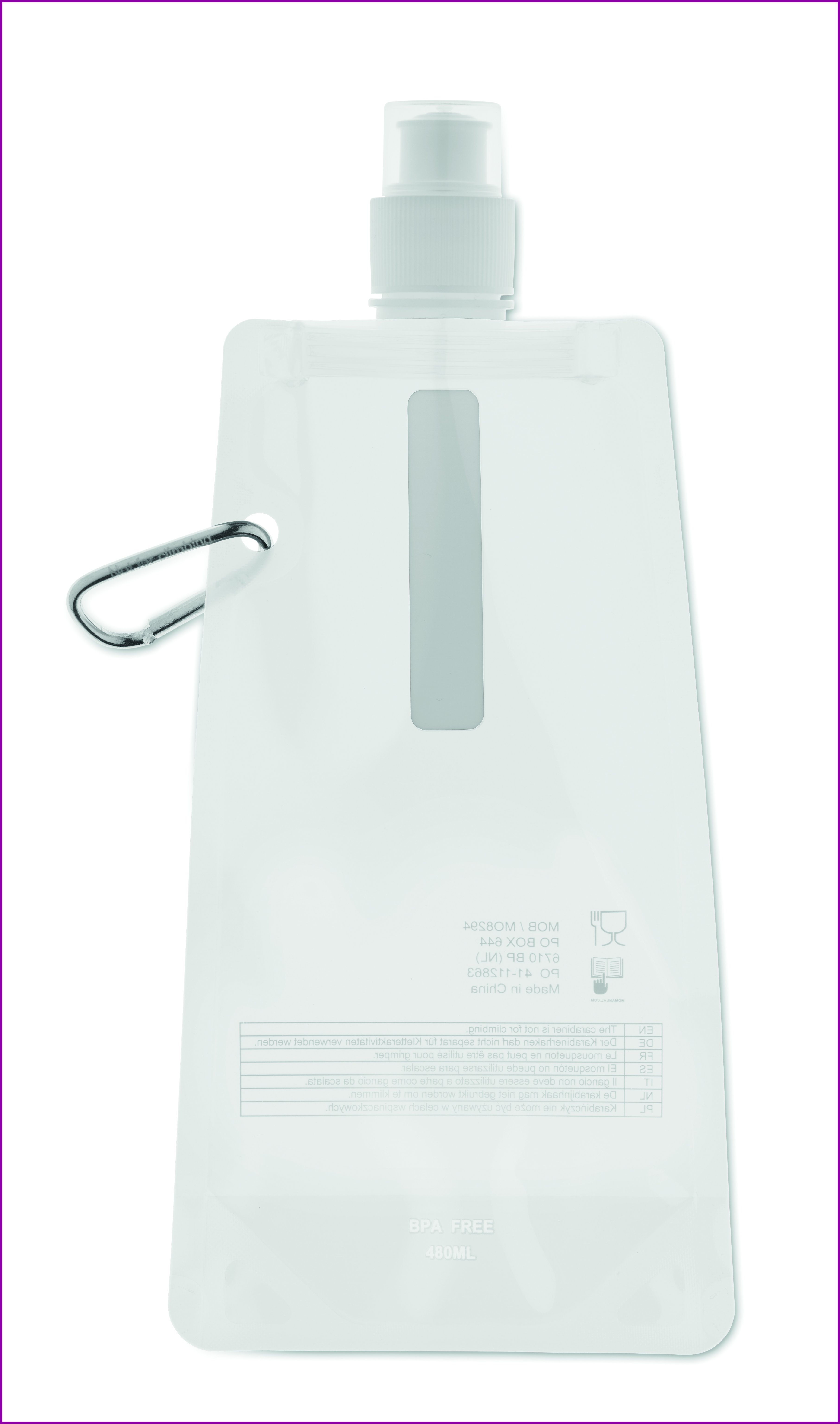 Taitettava 480 ml vesipullo PET- materiaalia, BPA vapaa ja alumiinisella karabiinikoukulla varustettu.