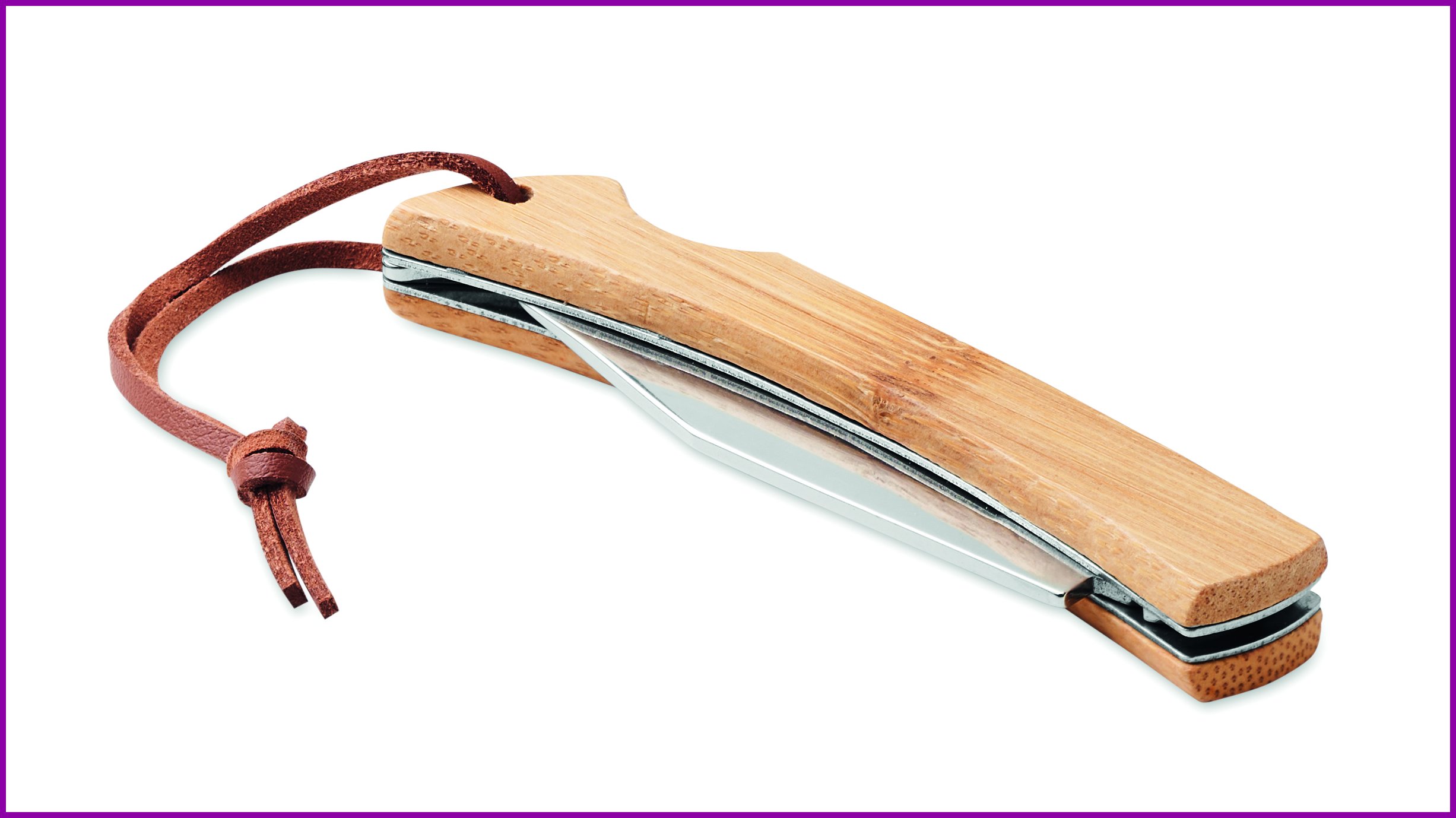 Kokoontaitettava veitsi 2CR13 ruostumattomasta teräksestä ja bambukahva PU- rannenauhalla.