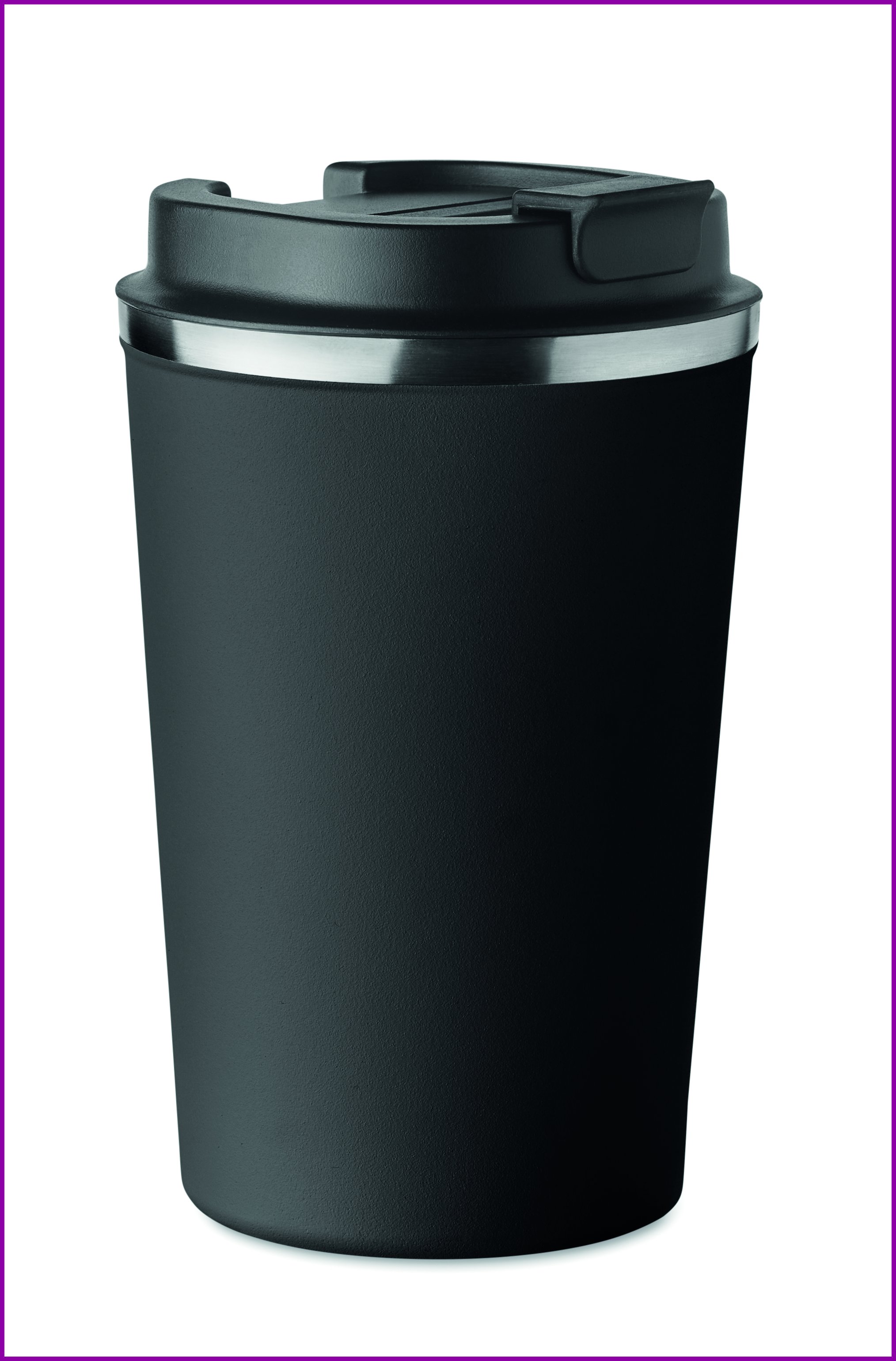 Kaksiseinäinen 350ml ruostumattomasta teräksestä valmistettu takeaway muki, PP kannella.Tuote on vuoto vapaa.