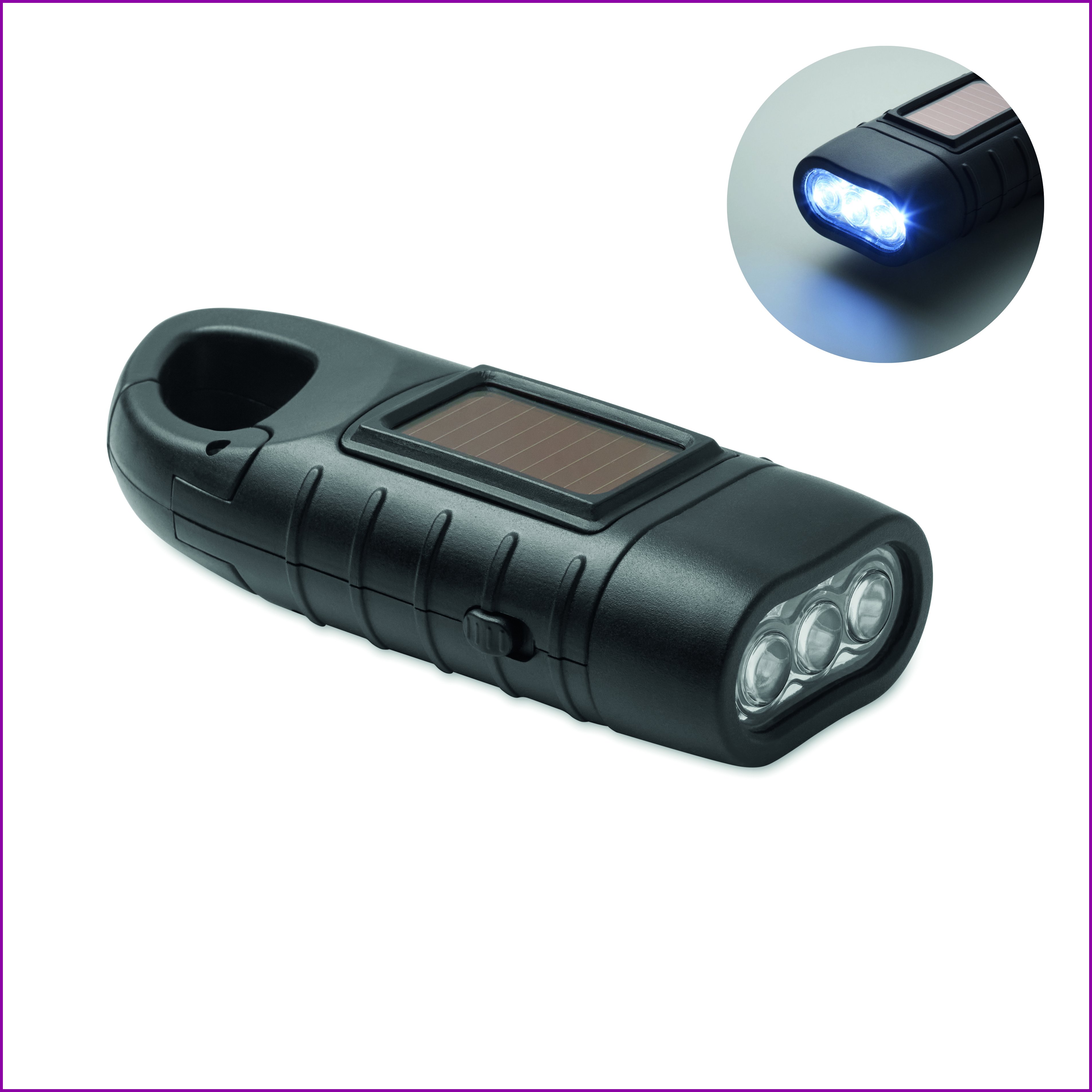 Taskulamppu, jossa on 3 valkoista LED-valoa. Latautuu sekä aurinkopaneelilla että dynamokammella. Varustettu 40 mAh akulla ja valmistettu kierrätetystä ABS-muovista.