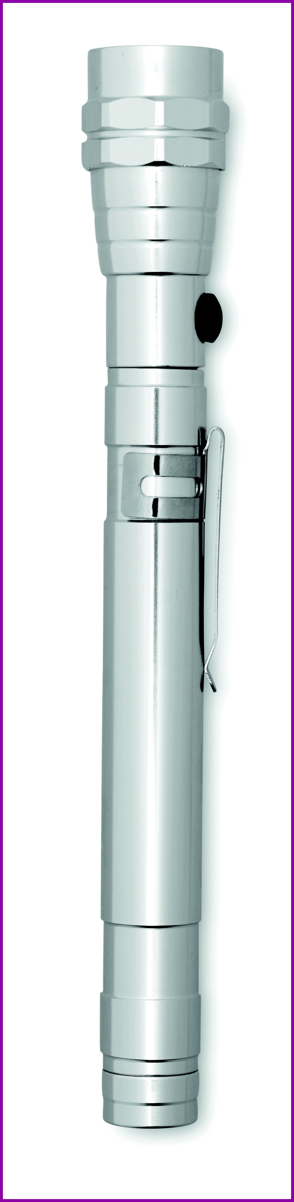 Pidennettävä alumiini taskulamppu, 3 LED-valoa, magneetti päässä ja klipsi. Sisältää 4 LR44 paristoa, tuotteen enimmäispituus 57 cm.