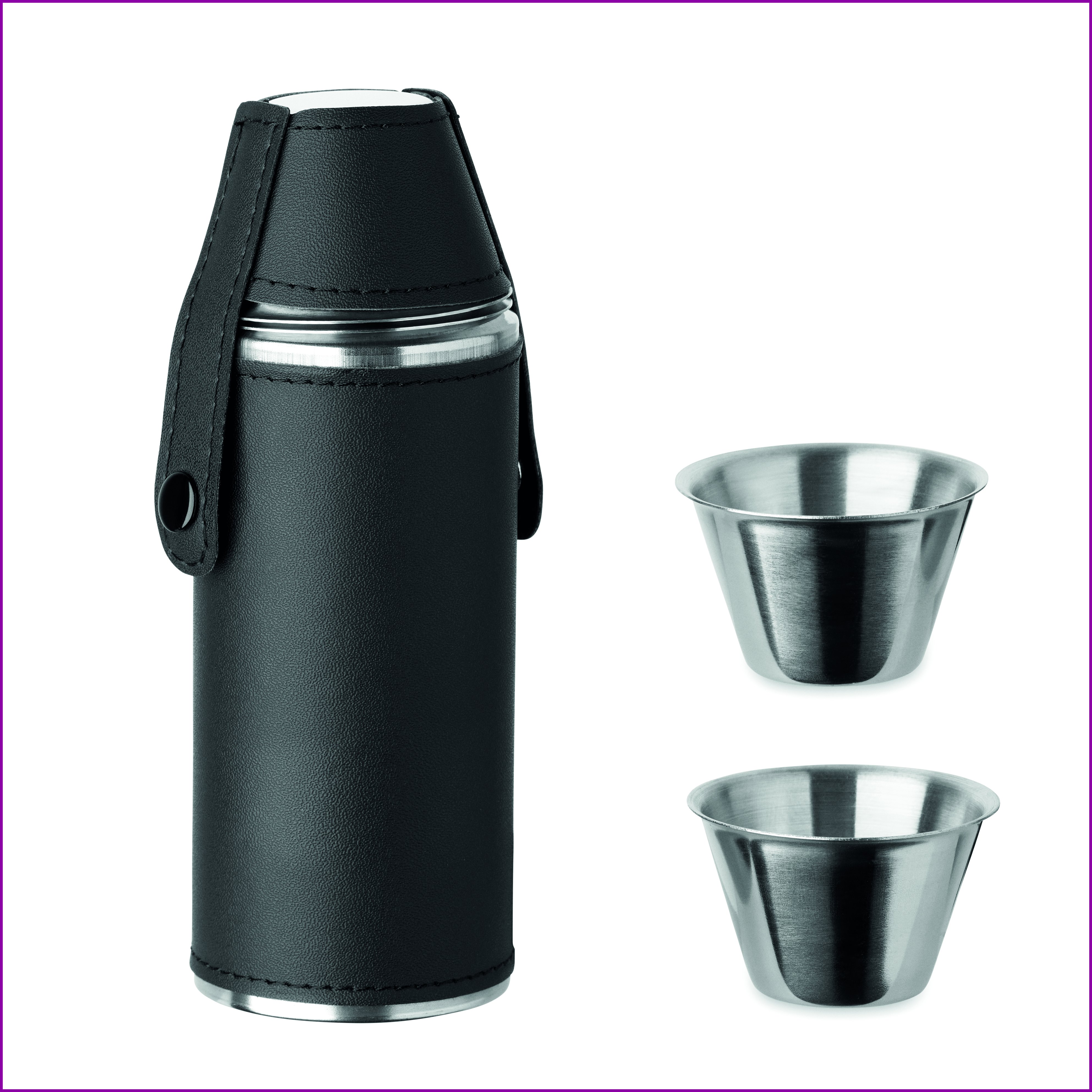 Ruostumattomasta teräksestä valmistettu taskumatti, jossa PU-nahkapinta ja kaksi ruostumattomasta teräksestä valmistettua 20 ml:n shottimukia kannessa. Tilavuus: 230 ml.