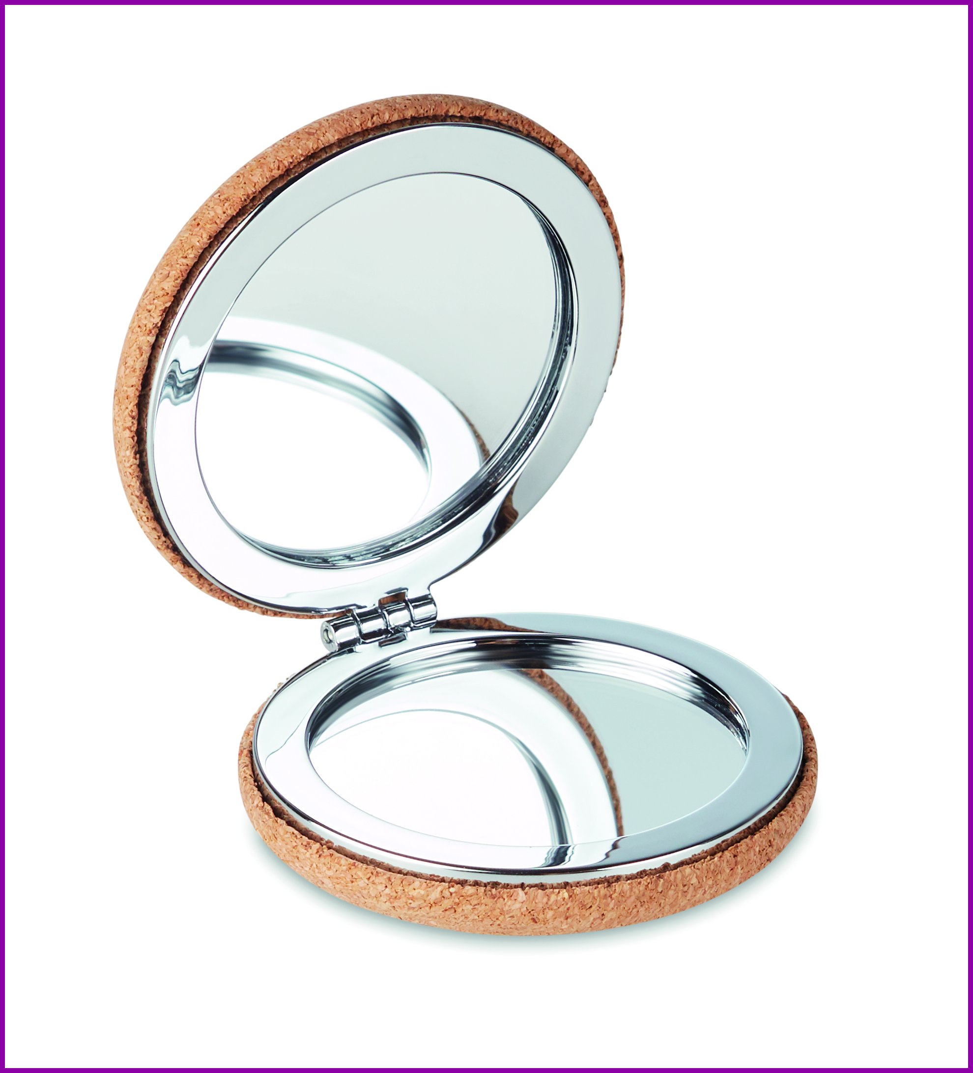 Pyöreä kaksipuolinen taskupeili korkkikuorilla. Korkki on luonnonmateriaali, strukturaalinen laatu ja pinnan huokoisuus voi aiheuttaa eroavaisuuksia tuotteissa painatuksen jälkeen