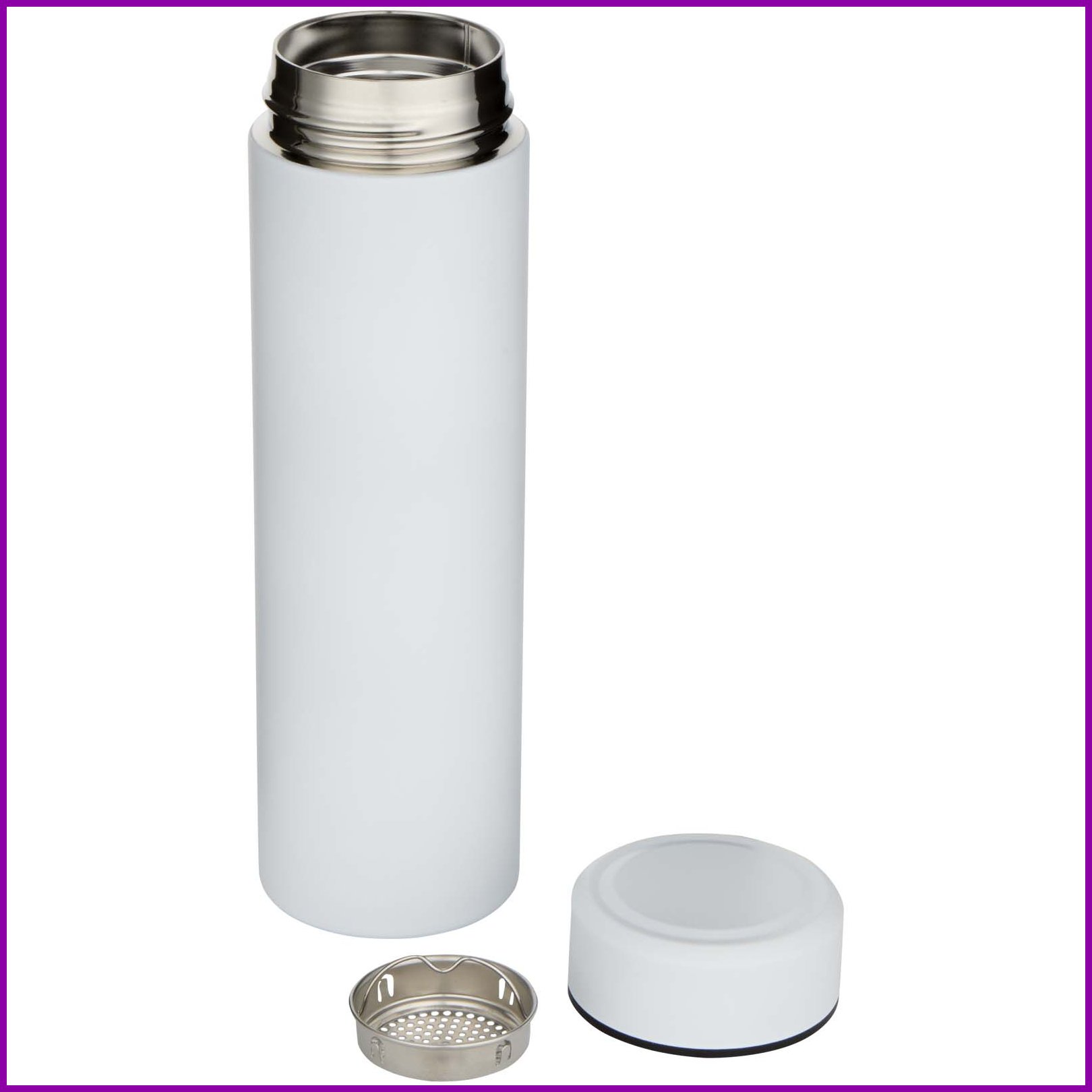 Pyydä tarjous painatuksesta tuotteseen Taylor 450 ml:n tuplaseinäinen, ruostumattomasta teräksestä valmistettu termospullo teesuodattimella Valkoinen