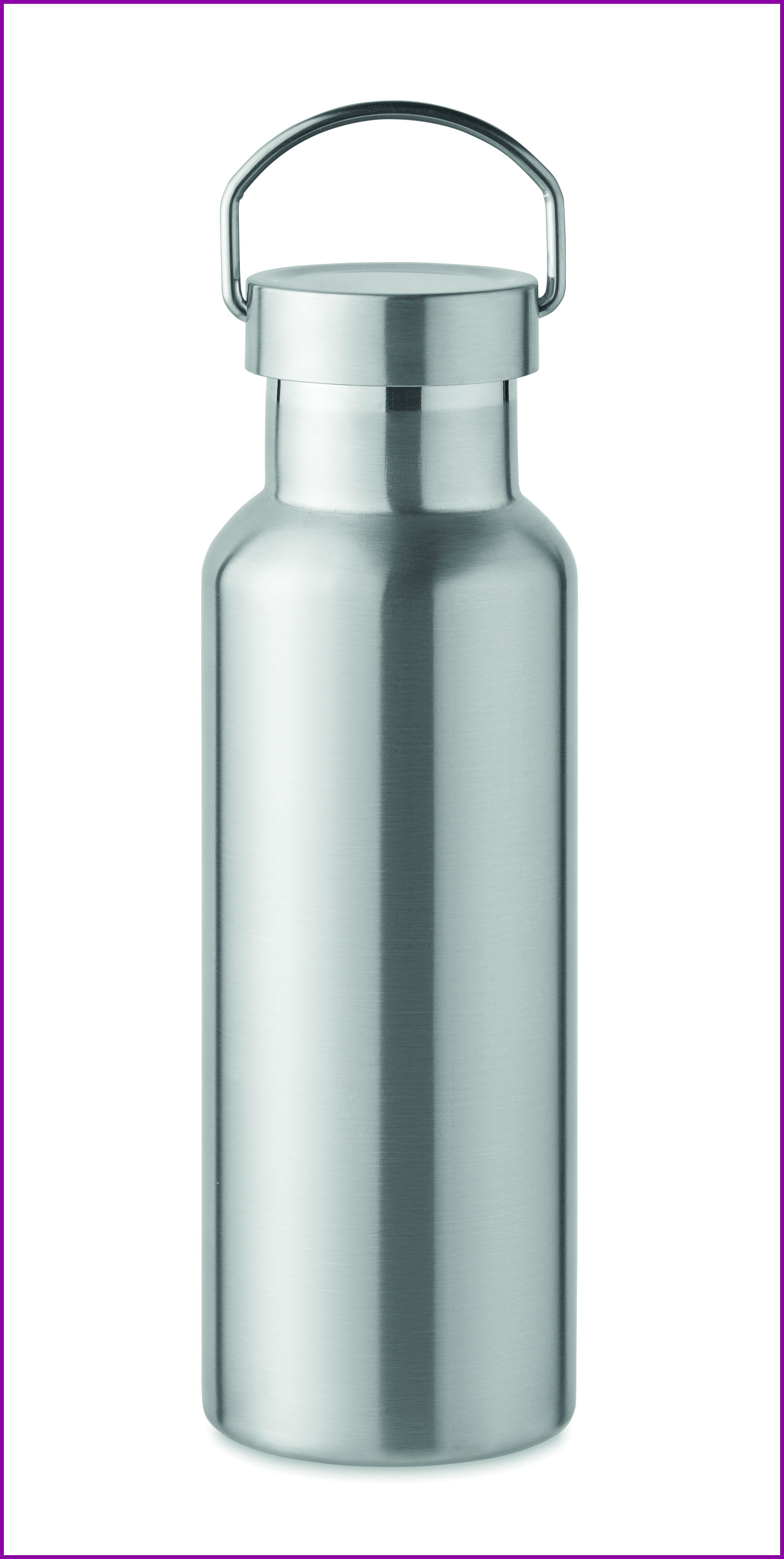 Kaksiseinäinen eristävä tyhjiöpullo kierrätetystä ruostumattomasta teräksestä (90 % kierrätettyä ruostumatonta terästä ja 10 % ruostumatonta terästä), jossa on kahvallinen korkki. Tilavuus: 500 ml.
