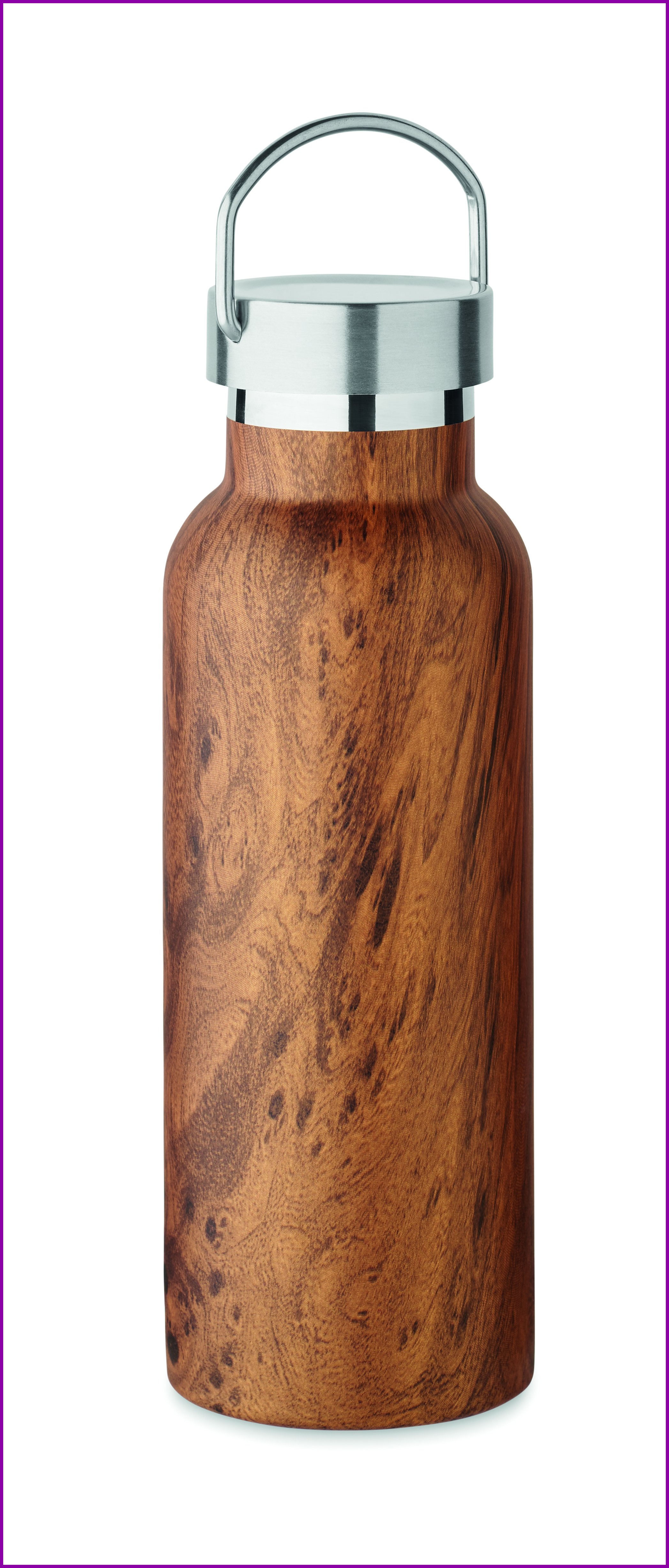 Kaksiseinäinen eristävä tyhjiöpullo kierrätetystä ruostumattomasta teräksestä (90 % kierrätettyä ruostumatonta terästä ja 10 % ruostumatonta terästä). Pullossa puupintaa jäljittelevä pinnoite ja kantokahvainen korkki. Vuotamaton. Tilavuus: 500 ml.