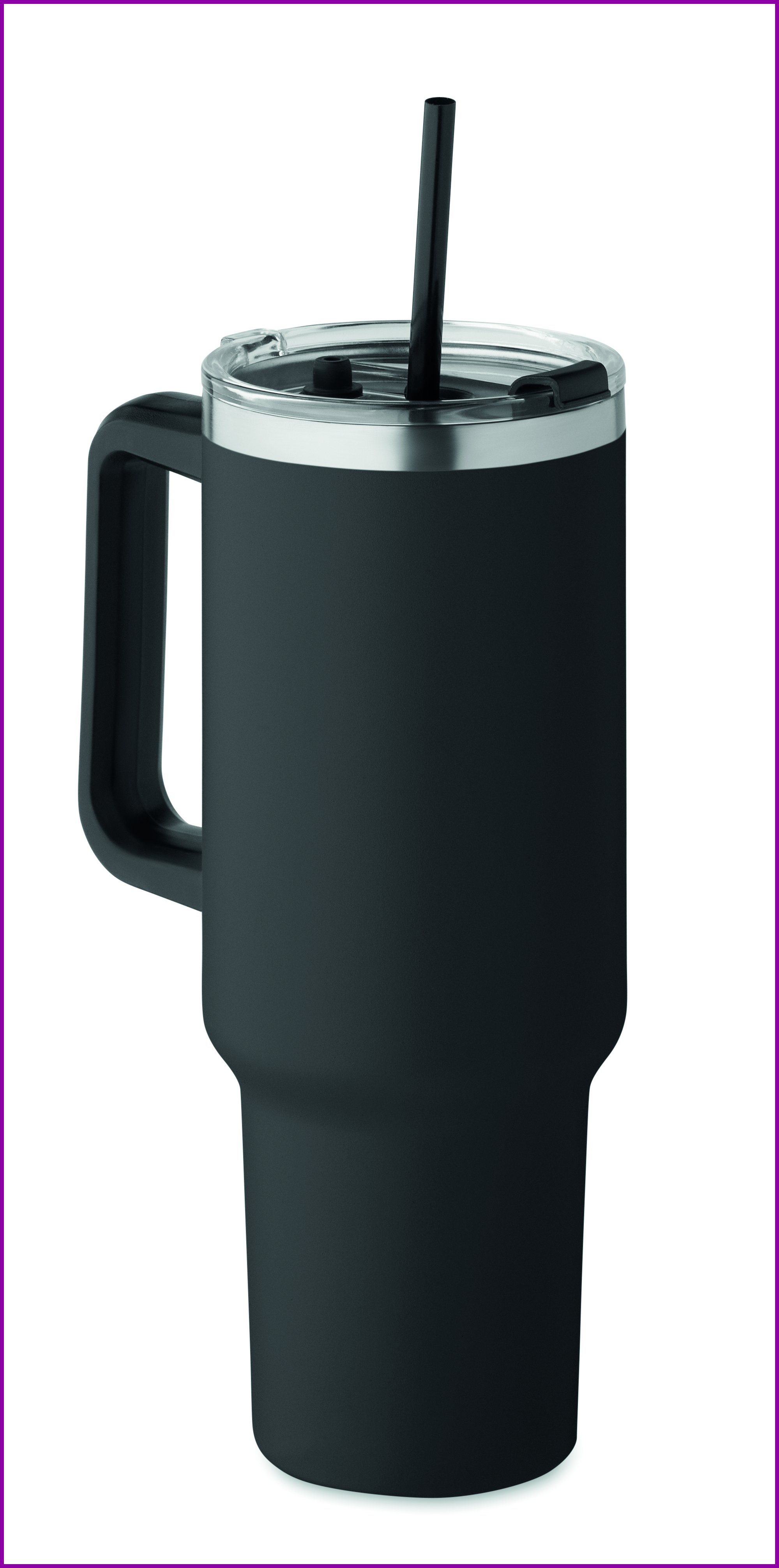 Kierrätetystä ruostumattomasta teräksestä valmistettu kaksiseinäinen muki, jonka kannessa PE-pilli. Tilavuus 1200 ml. (90 % kierrätettyä ruostumatonta ja 10 % ruostumatonta terästä).