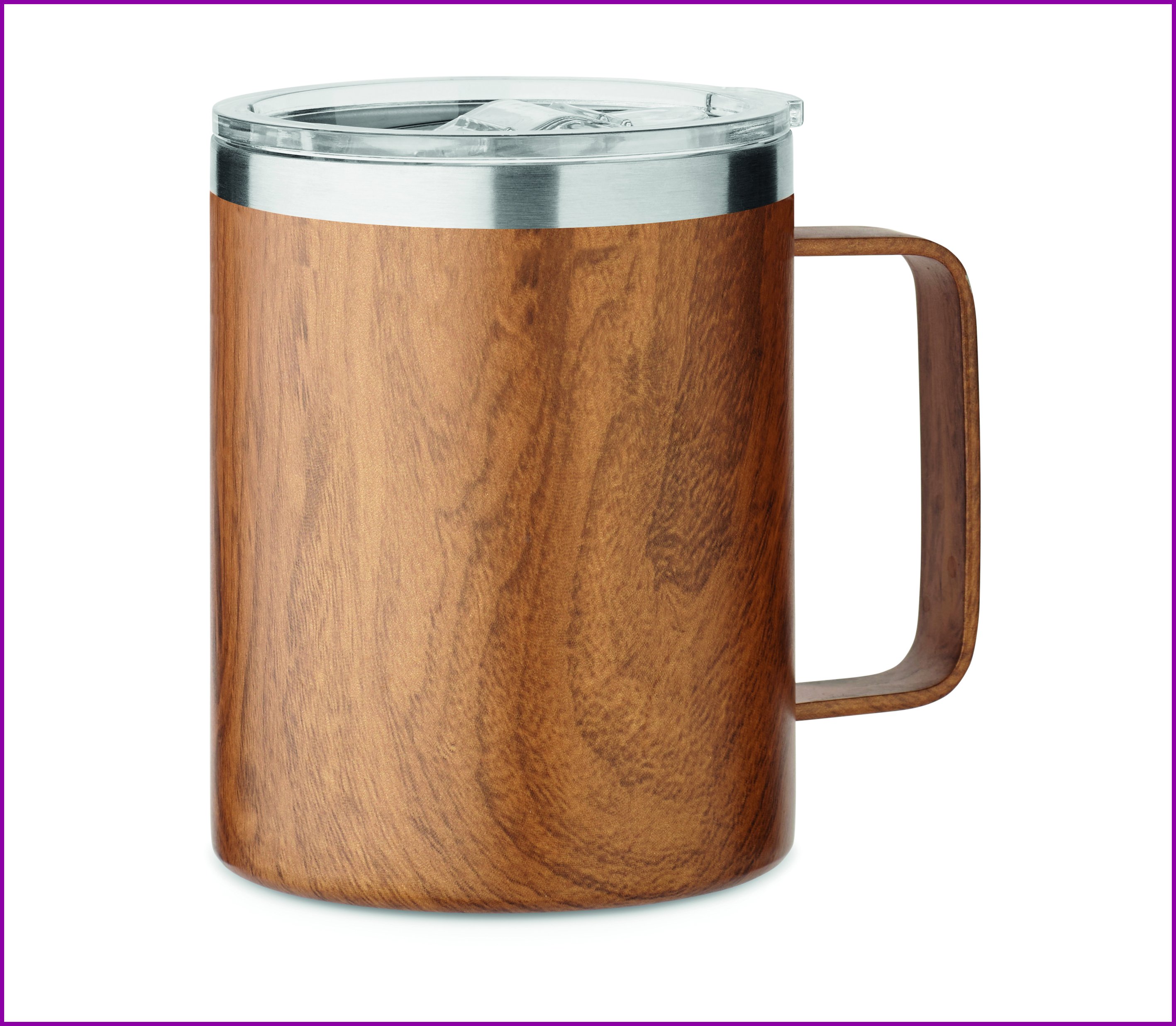 Kaksiseinäinen kierrätetystä ruostumattomasta teräksestä (90 % kierrätettyä ruostumatonta terästä ja 10 % ruostumatonta terästä) valmistettu termosmuki, jossa on puupintaa jäljittelevä pinnoite. Tilavuus: 300 ml.