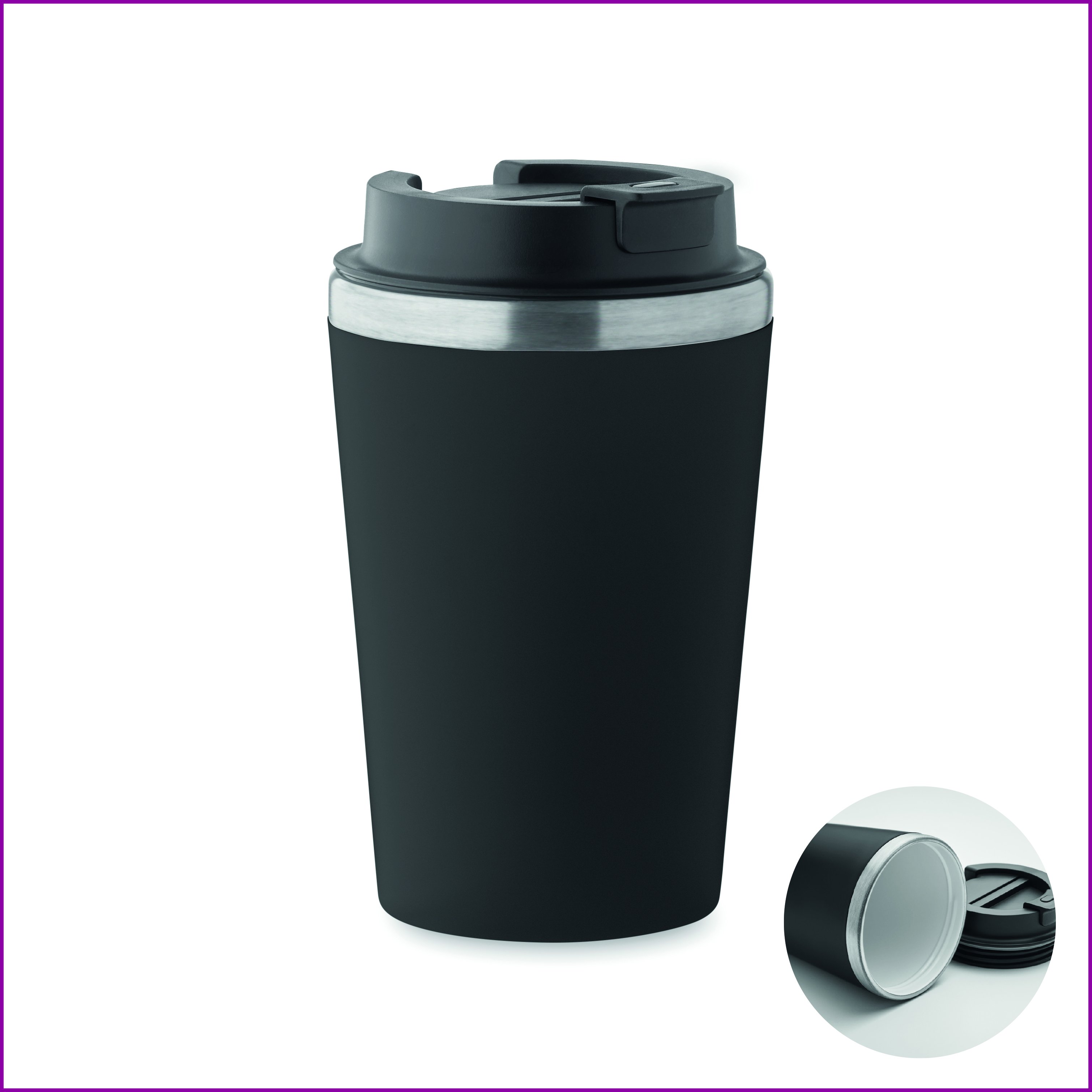 Kaksiseinäinen termosmuki, ulkopinta PP, sisäpinta on kierrätettyä ruostumatonta terästä (90 % kierrätettyä ruostumatonta terästä ja 10 % ruostumatonta terästä) jossa on keraaminen pinta. Vuotamaton. Tilavuus: 350 ml.