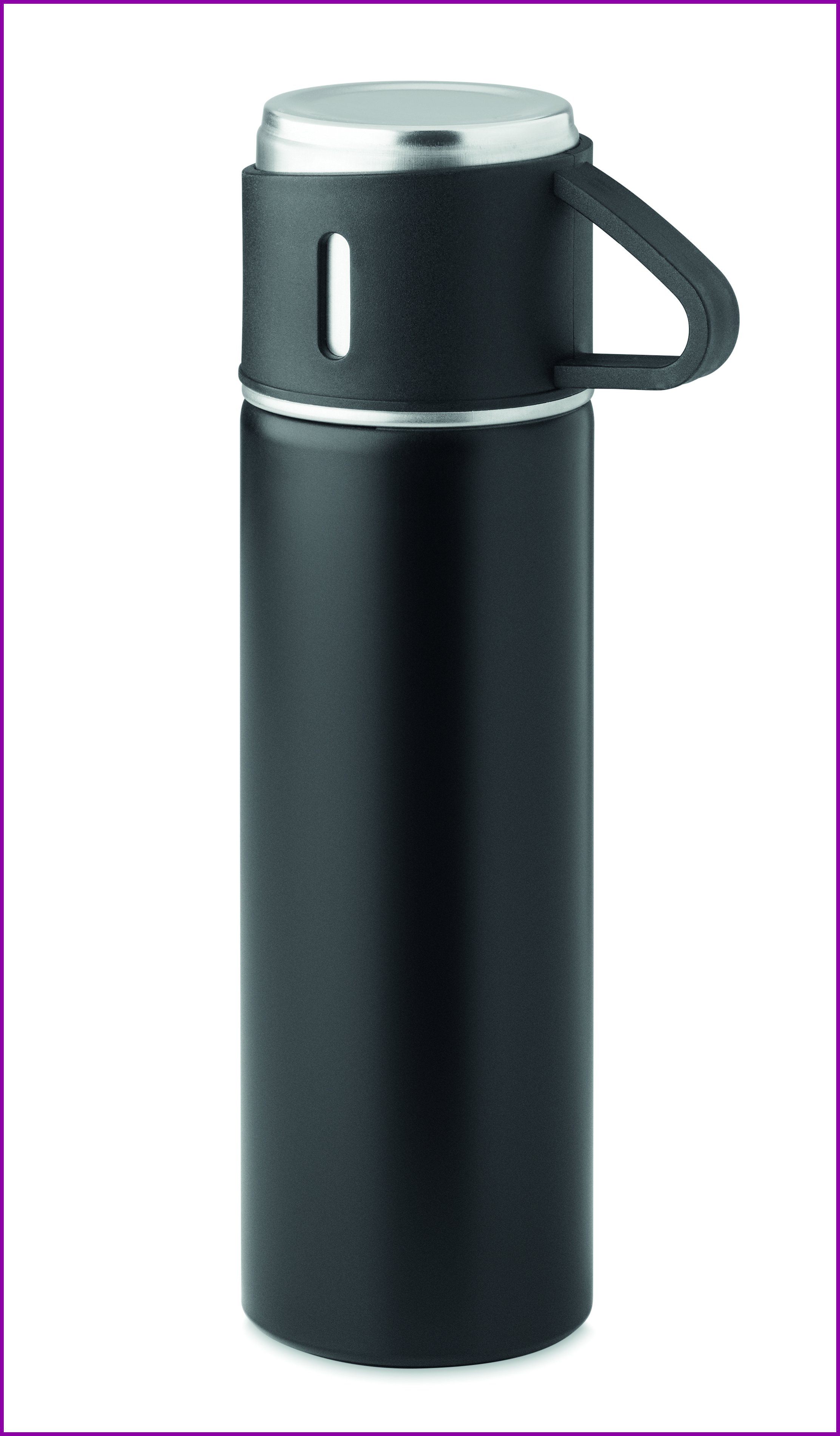 Kaksiseinäinen ruostumattomasta teräksestä valmistettu tyhjiöeristetty pullo, jossa on tiivis kuppina toimiva korkki. Tilavuus: pullo 420 ml, kuppi 150 ml.