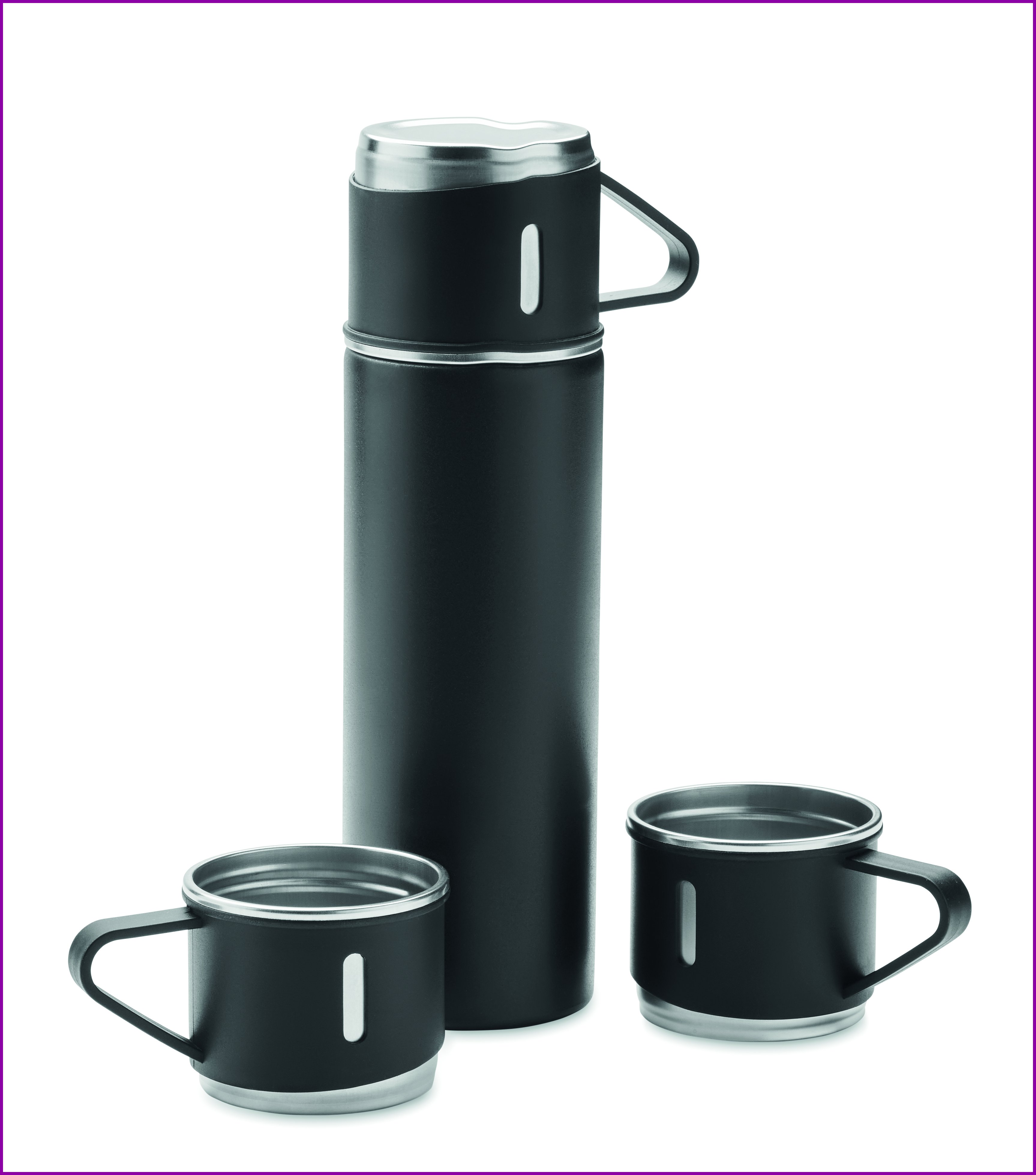 Kaksiseinäinen ruostumattomasta teräksestä valmistettu tyhjiöeristetty termospullo, jossa on tiivis kuppina toimiva korkki ja 2 lisäkuppia. Tilavuus: pullo - 420 ml, kuppi - 150 ml.