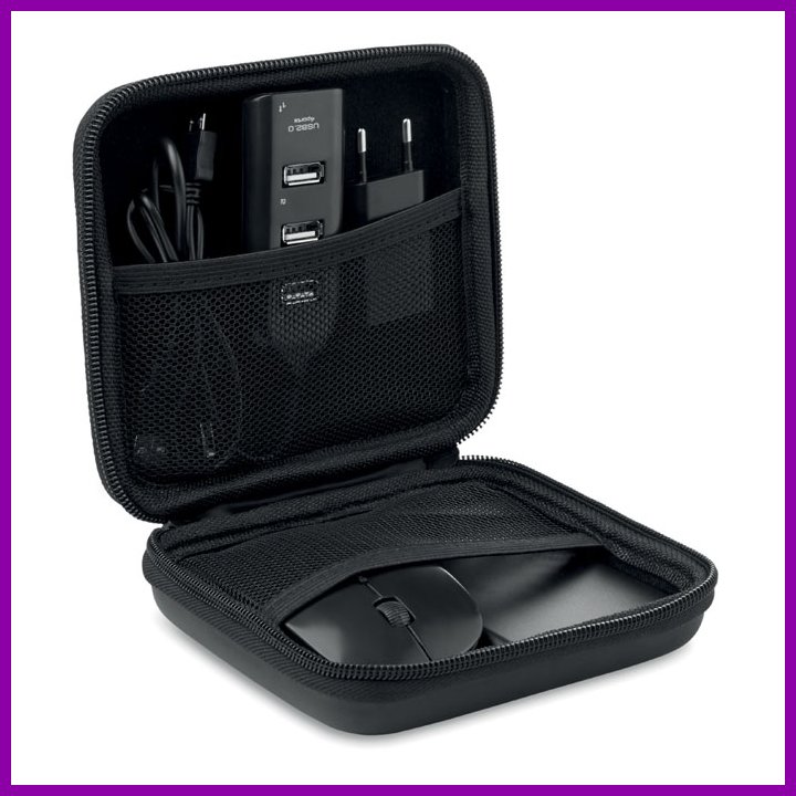 Tietokonetarvikkeet EVA / PU-pussissa, sisältää langattoman hiiren, 4-porttisen 2.0 USB keskittimen, EU-pistokkeen ja 4000 mAh: n varavirtalähteen. Mukana micro-USB latauskaapeli.