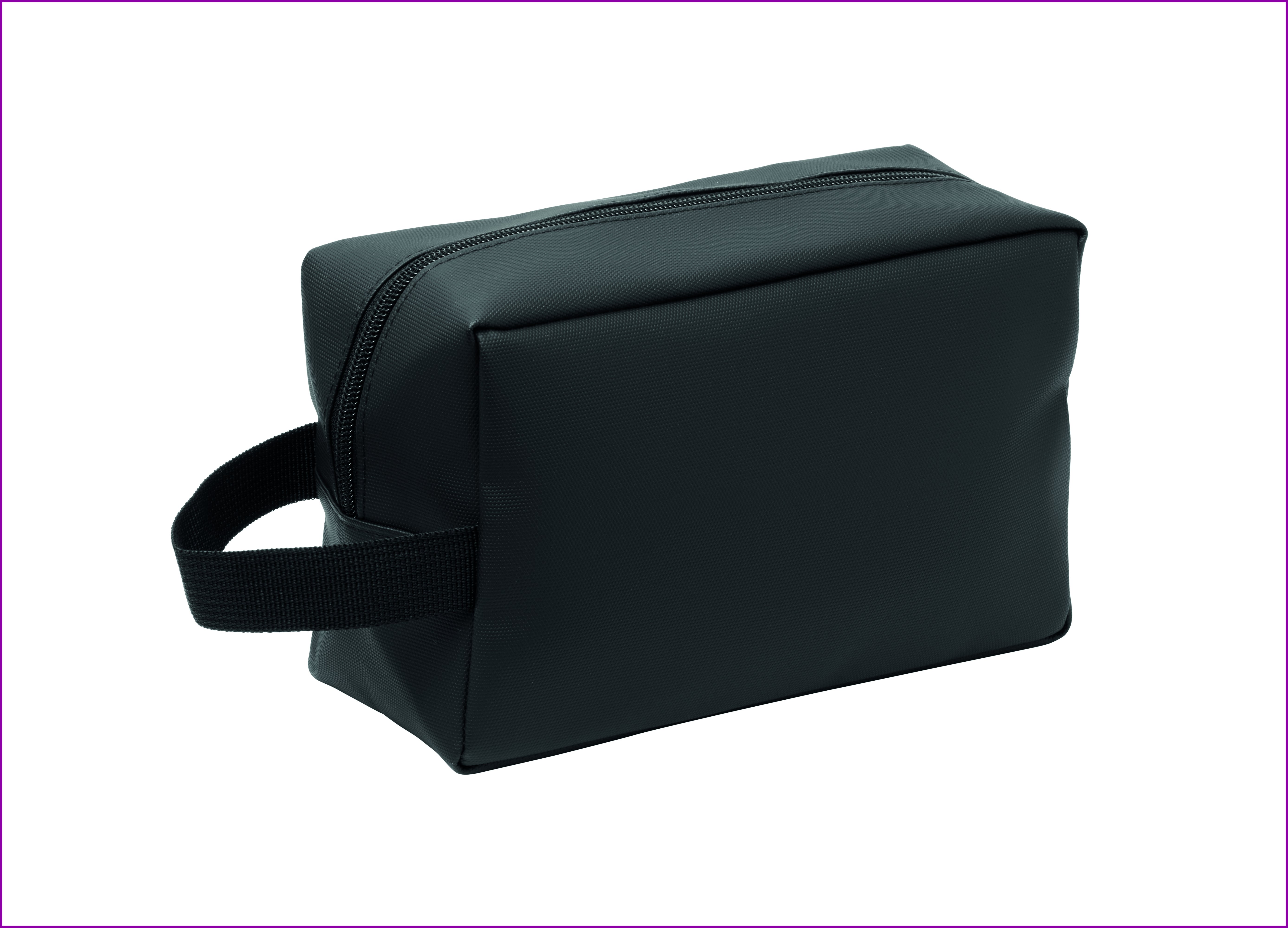 600D RPET -polyesterikankaasta valmistettu toilettilaukku, jossa on PU-pinnoite ja 210D RPET -vuori. Vetoketjullinen etutasku ja kantokahva.
