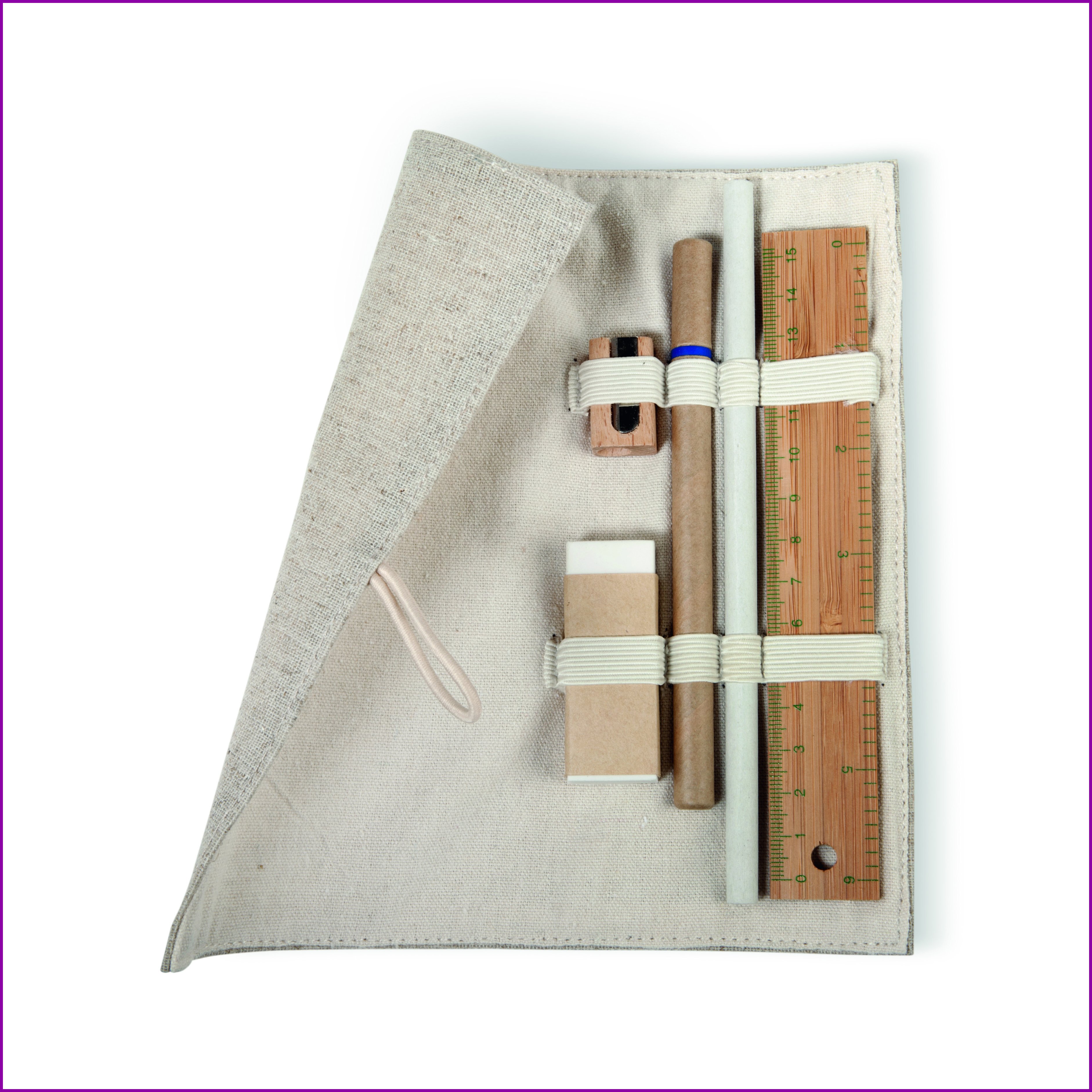 6-osainen toimistosetti, sisältää juutti/puuvillapussin, bambuviivoittimen, puisen teroittimen, pyyhekumin, paperikynän, kuulakärkikynän sinisellä musteella ja pahvisella rungolla.