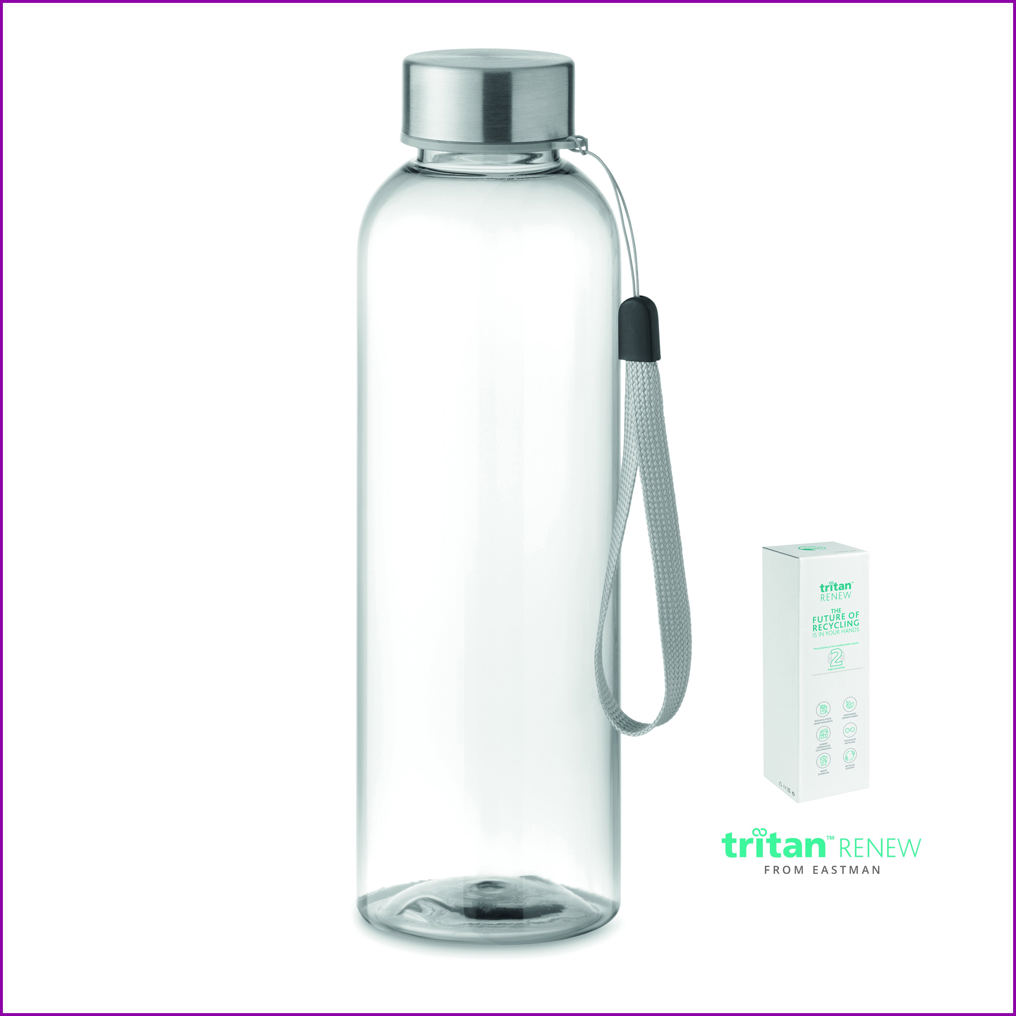 Juomapullo Tritan Renew™ -materiaalista, joka on BPA-vapaata. Pullossa on ruostumattomasta teräksestä valmistettu kahvallinenkorkki. Vuotamaton. Tilavuus 500 ml. Tämä tuote on valmistettu 50 %:sti jätemuovista ISCC:n sertifioidun massataseen avulla.