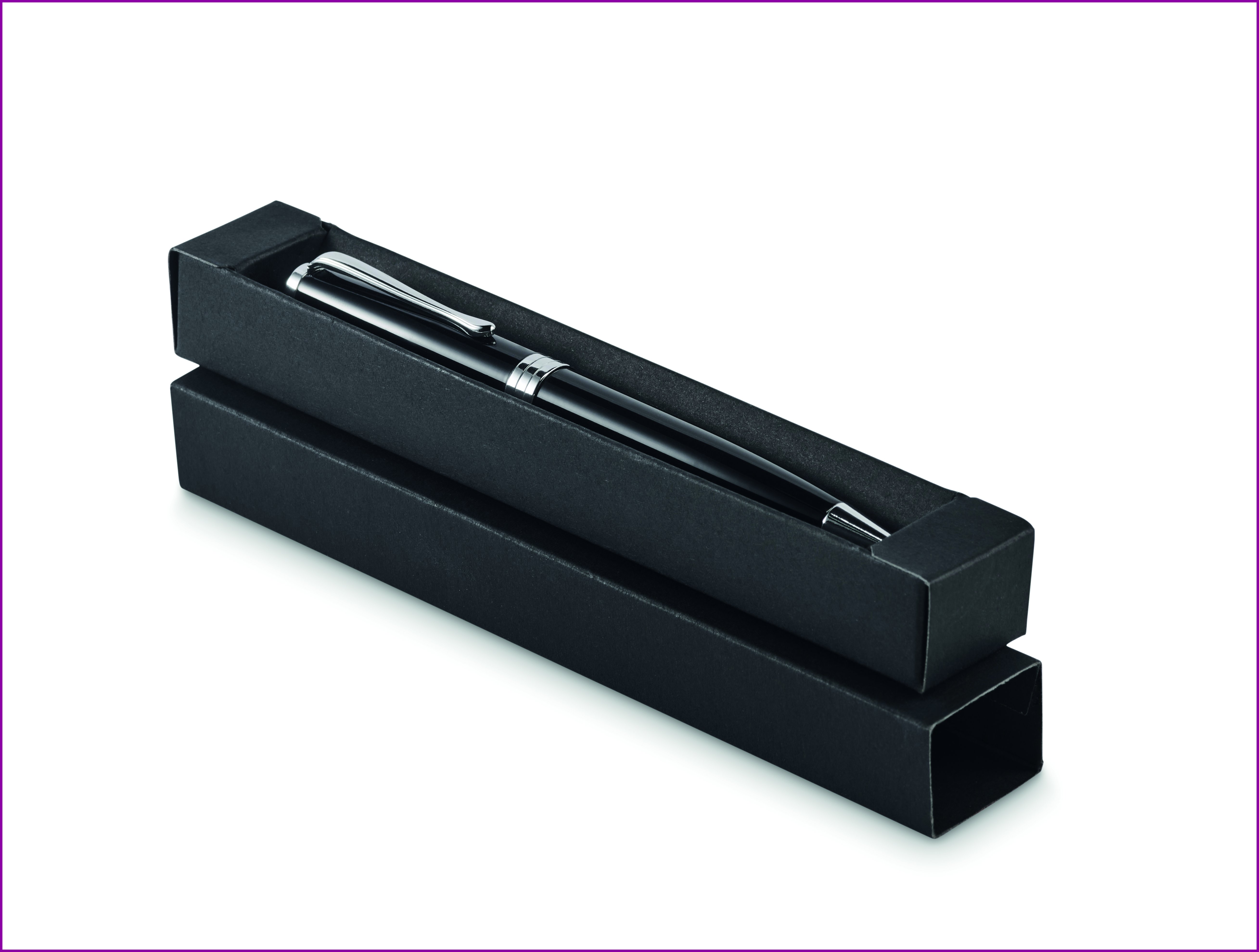 Kierrettävästä ruostumattomasta teräksestä valmistettu kuulakärkikynä. Sininen muste. Toimitetaan lahjapakkauksessa.