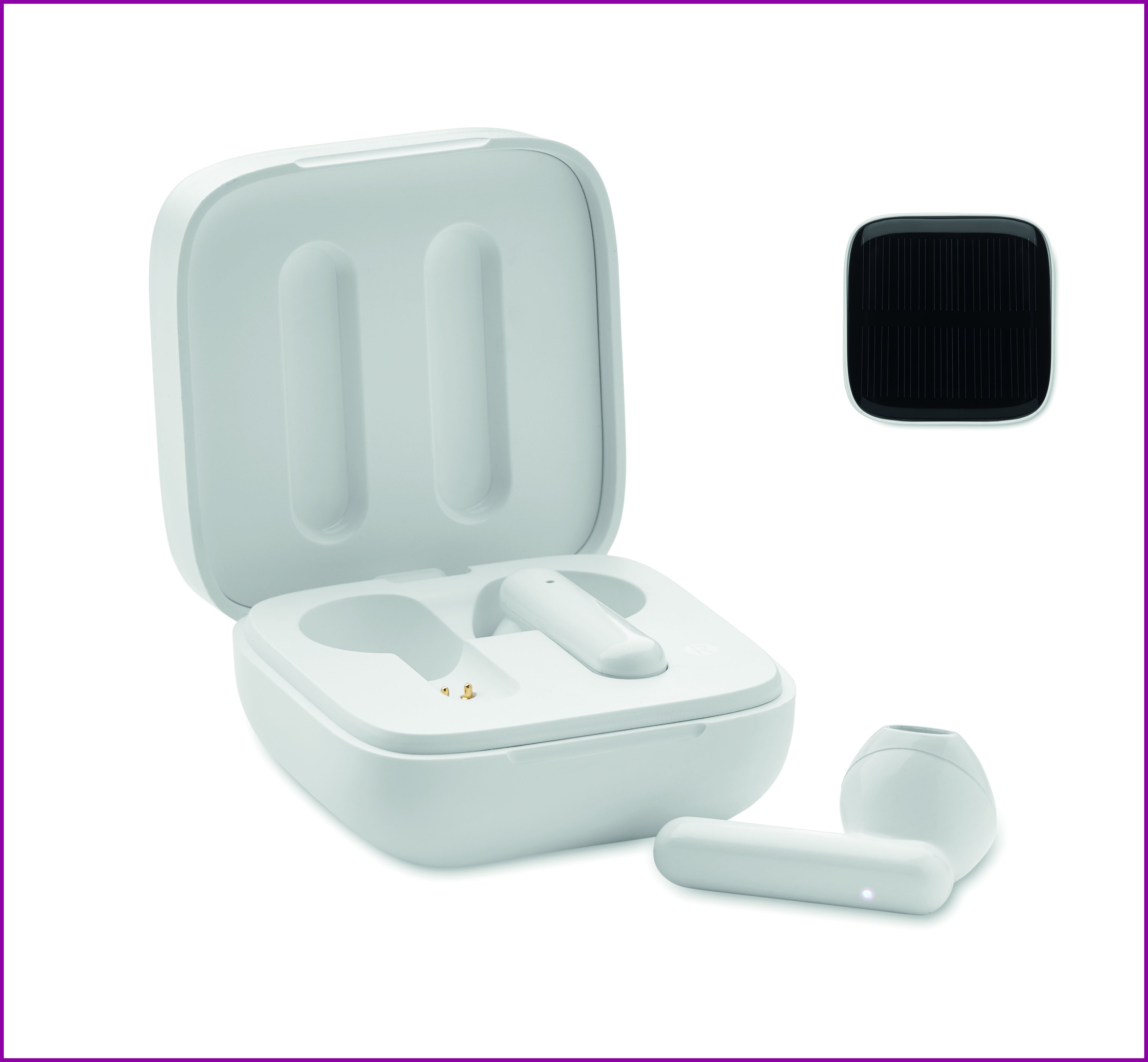 ABS True Wireless Stereo (TWS) 5.3 langattomat korvanapit mikrofonilla ja 30 mAh akulla. Toistoaika n. 4 tuntia. Aurinkokennolaturi. Automaattinen pariliitos. Mukana C-tyypin latauskaapeli ja 200 mAh latausasema.