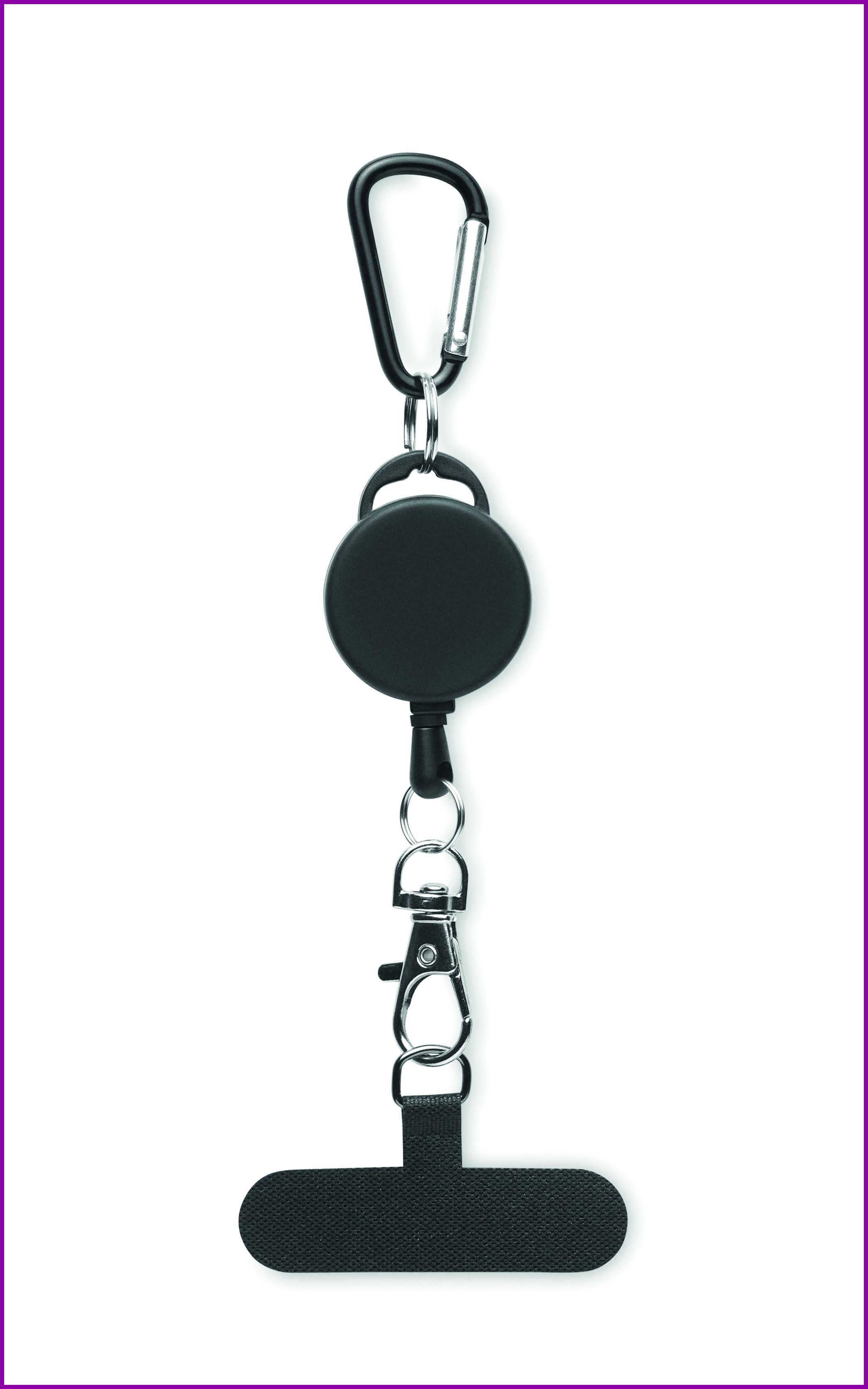 Sisäänvedettävä puhelinpidike ja/tai nimilapun pidike ABS-muovista, jossa alumiininen karabiinilukko. Karabiinilukko ei ole tarkoitettu kiipeilyyn (ei-ammattikäyttöön).