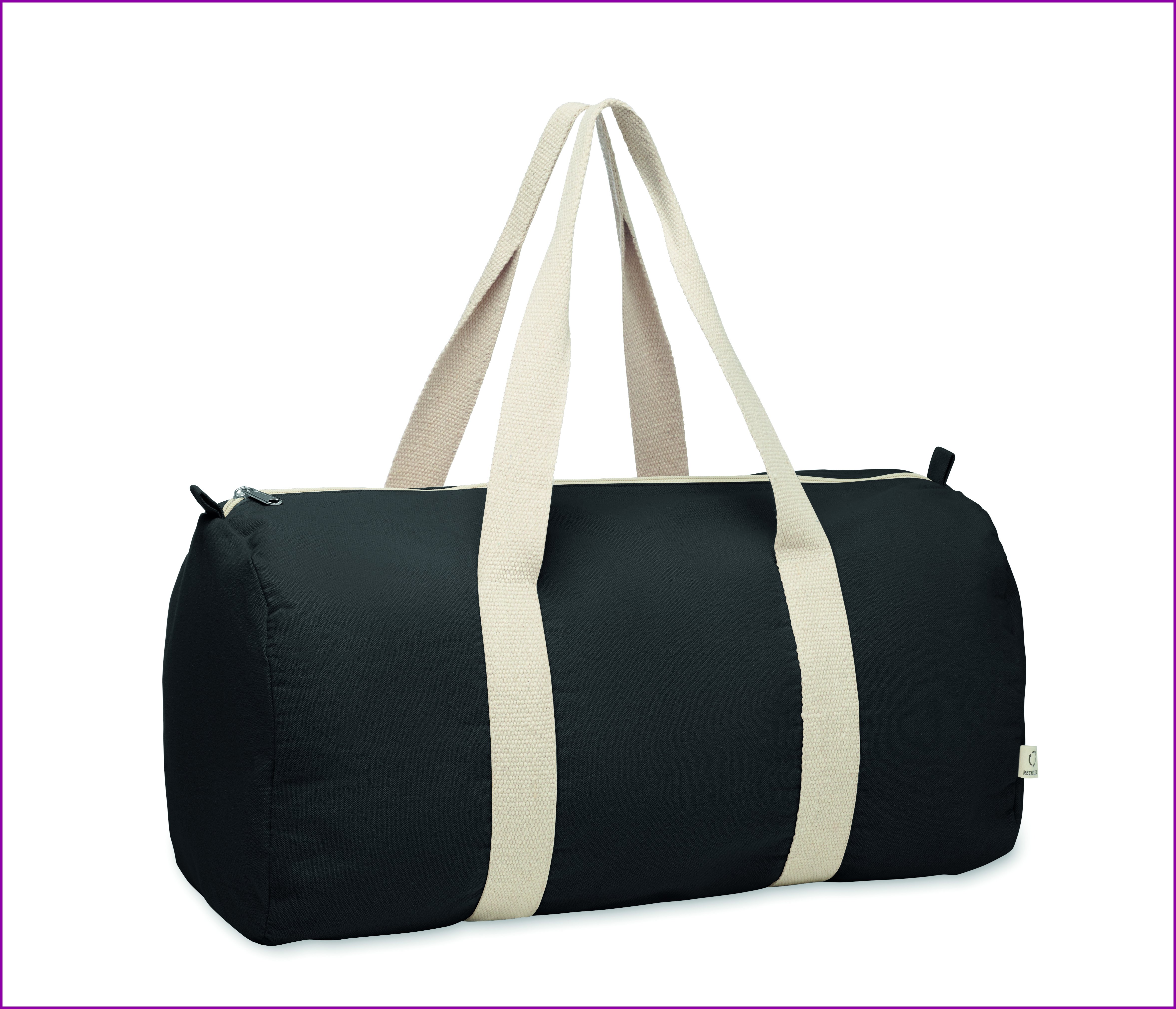 Duffelilaukku, urheilu- tai matkalaukku, jossa on vetoketjullinen sivulokero ja vetoketjullinen sisätasku, 320 gr/m² kierrätettyä puuvillaa (80 %) ja kierrätettyä polyesteriä (20 %), pitkät kahvat.
