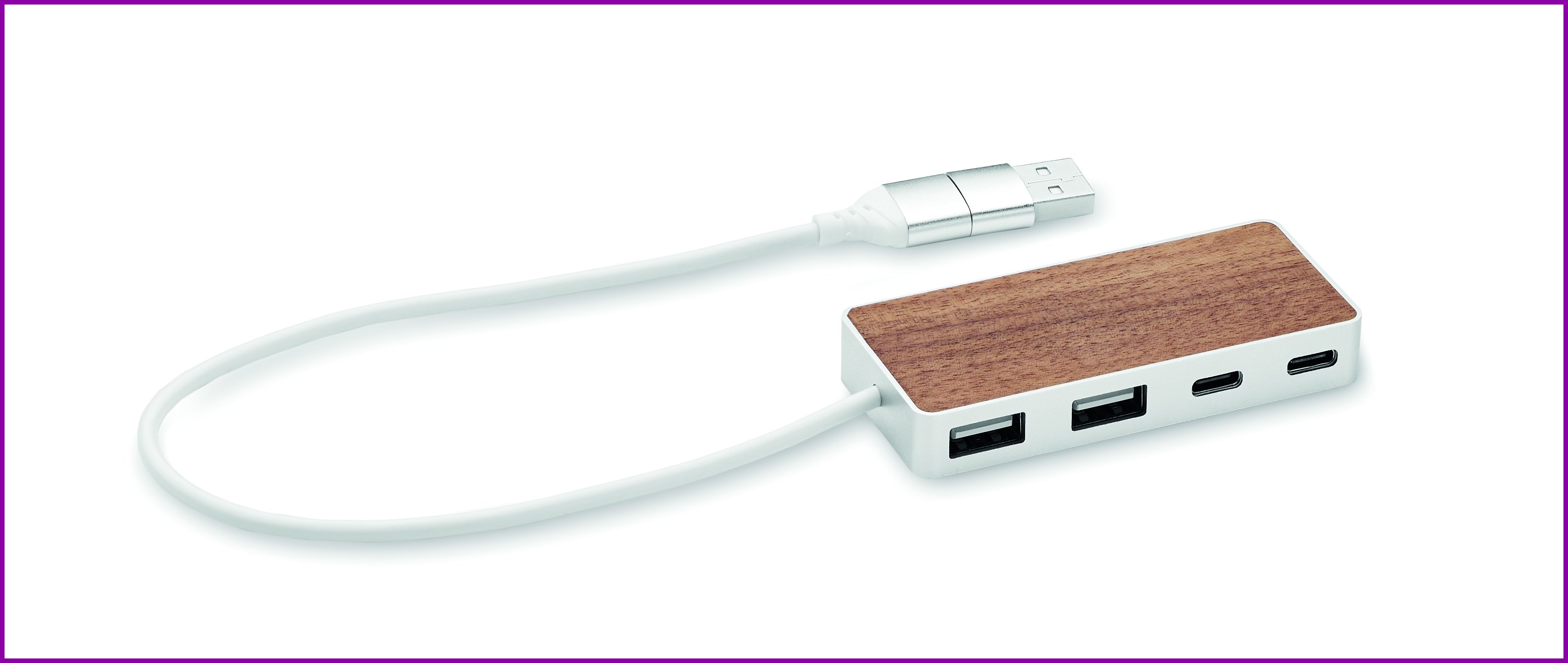 4-porttinen USB-keskitin kierrätysalumiinikotelossa ja pähkinäpintaisella yläosalla. Lähtö: 2 x Type-A ja 2 x Type-C. Tulo: 2-in-1 Type-C ja Type-A. Kaapelin pituus: 27,5 cm.