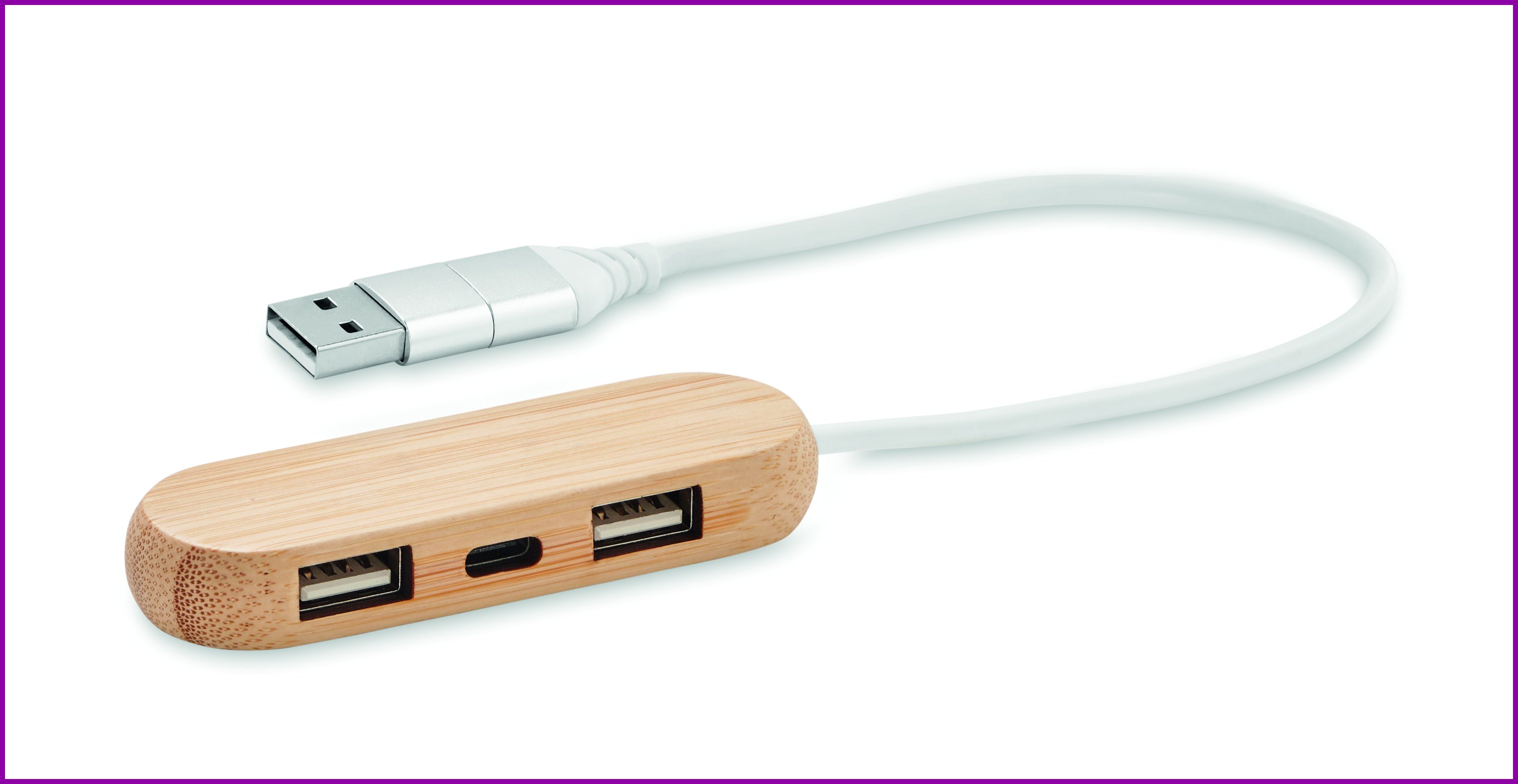 3-porttinen 2.0 USB-keskitin bambua. Lähtö: 2 x A-tyypin ja 1 x C-tyypin liitännällä. Kaapelin pituus 24 cm.