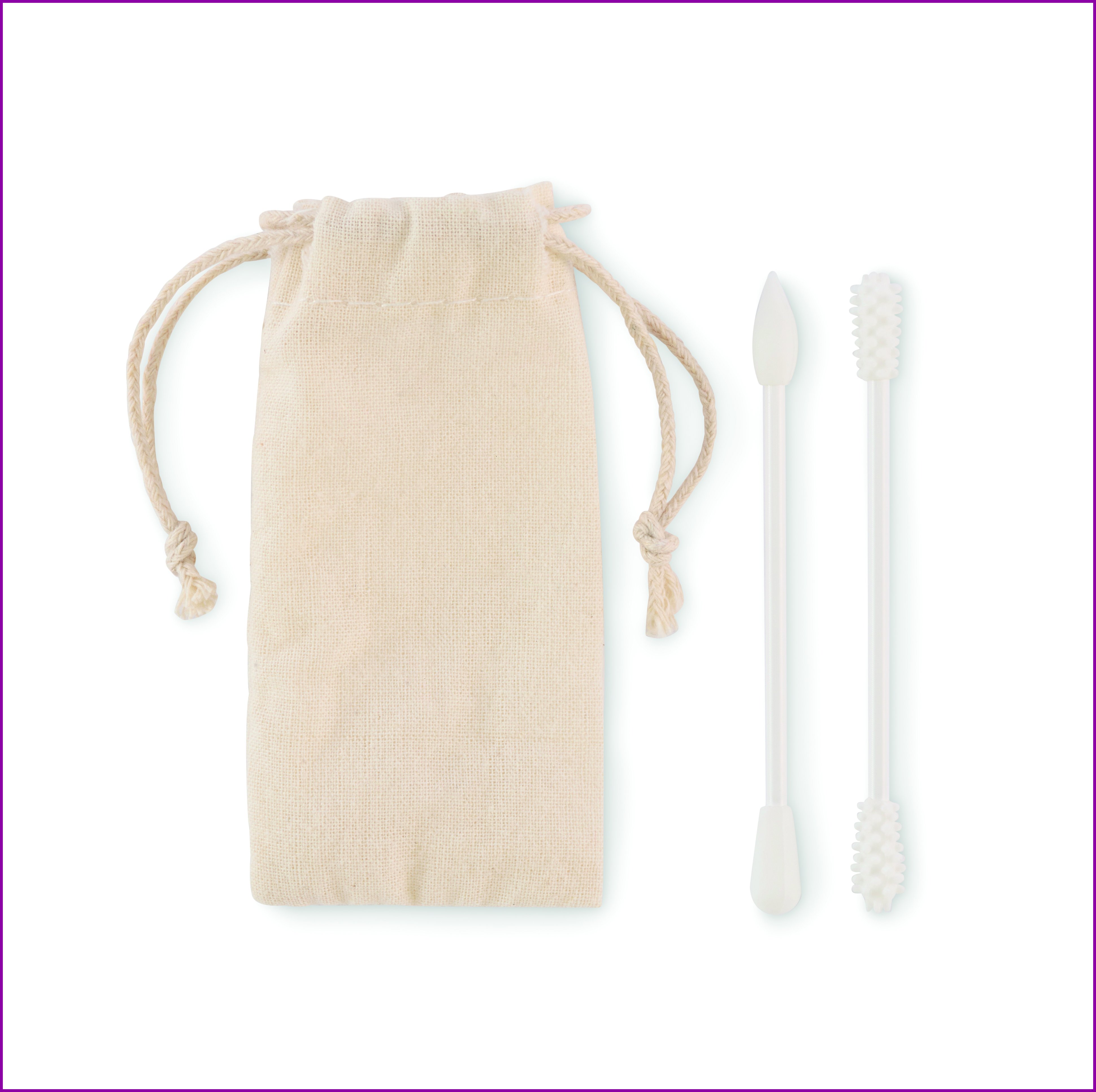 2 uudelleenkäytettävää ja pestävää silikonipuikkoa, jossa on 3 erilaista päätä. Toimitetaan kiristettävässä puuvillapussissa.